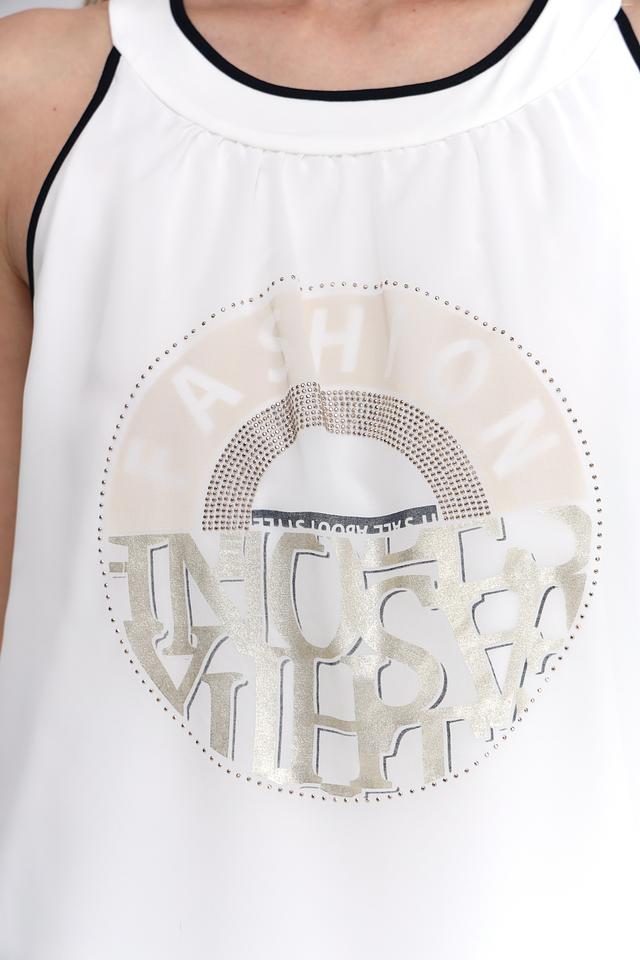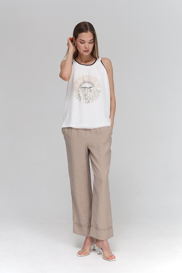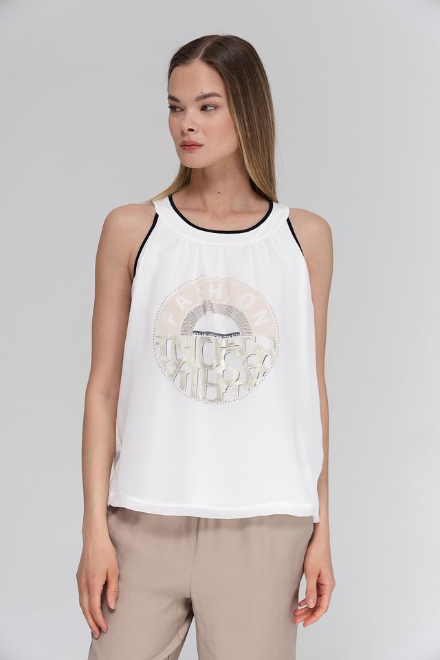 Топ имеет свободный крой и широкие бретели, что делает его идеальным для жаркой погоды. Особый акцент в дизайне — это оригинальный принт в бежево-золотистых тонах, выполненный в форме круга с надписью “FASHION”. Чёрная окантовка по горловине и пройме придаёт топу завершенный вид.