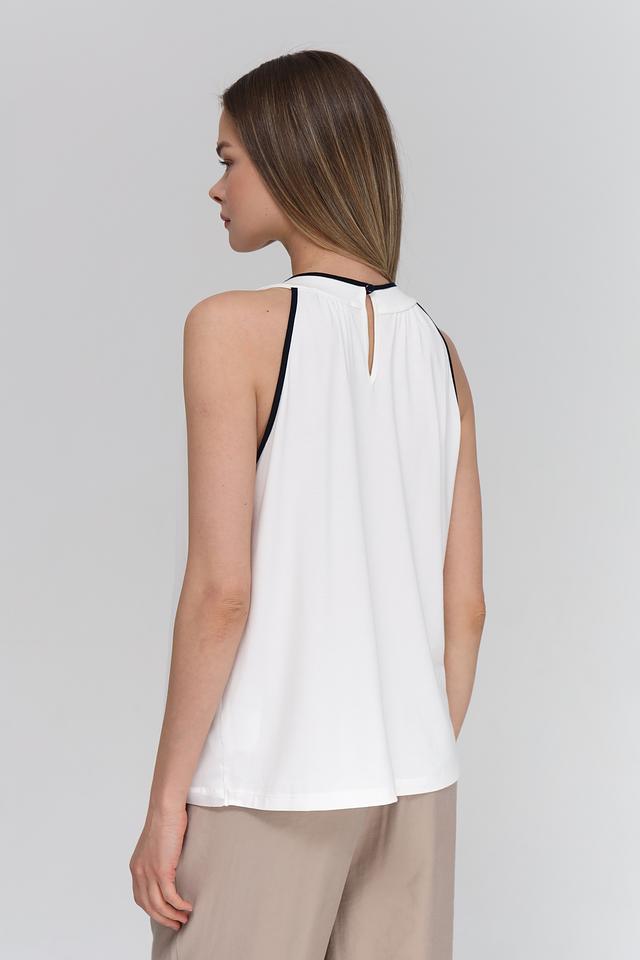 Белый топ Tuzzi с оригинальным принтом и чёрной отделкой — стильное и комфортное решение для летнего гардероба. Модель выполнена из лёгкой вискозы с добавлением эластана, обеспечивающего удобную посадку. Состав: вискоза 95%, эластан 5%