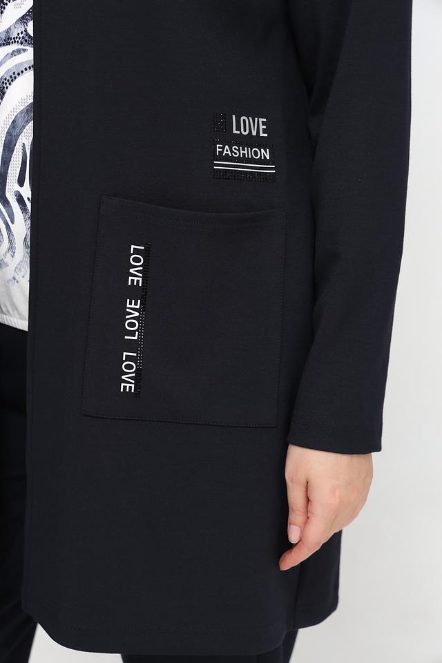 Материал, сочетающий в себе полиэстер, вискозу и эластан, обеспечивает комфорт и удобство в носке. Вискоза придает ткани мягкость и приятные тактильные ощущения, а эластан обеспечивает хорошую посадку по фигуре и устойчивость к деформации. Накладной карман декорирован надписью "LOVE LOVE LOVE".