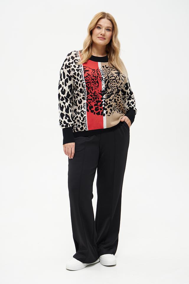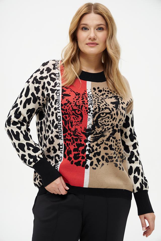 Пуловер имеет оригинальный принт, сочетающий в себе леопардовые пятна и изображение морды леопарда, а также надписи вдоль рукавов. Цветовая гамма включает в себя бежевый, чёрный и белый цвета, создавая эффектный контраст.