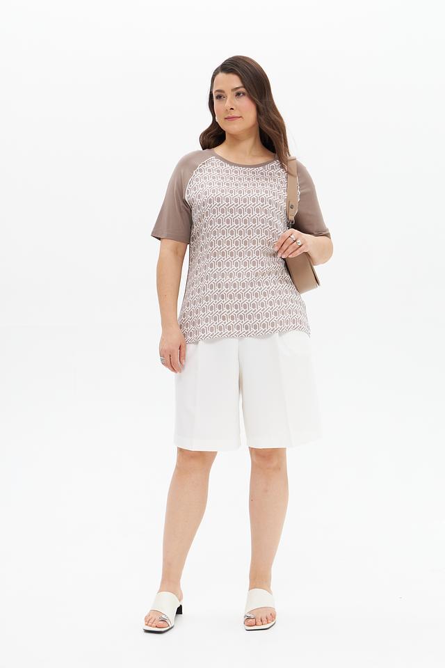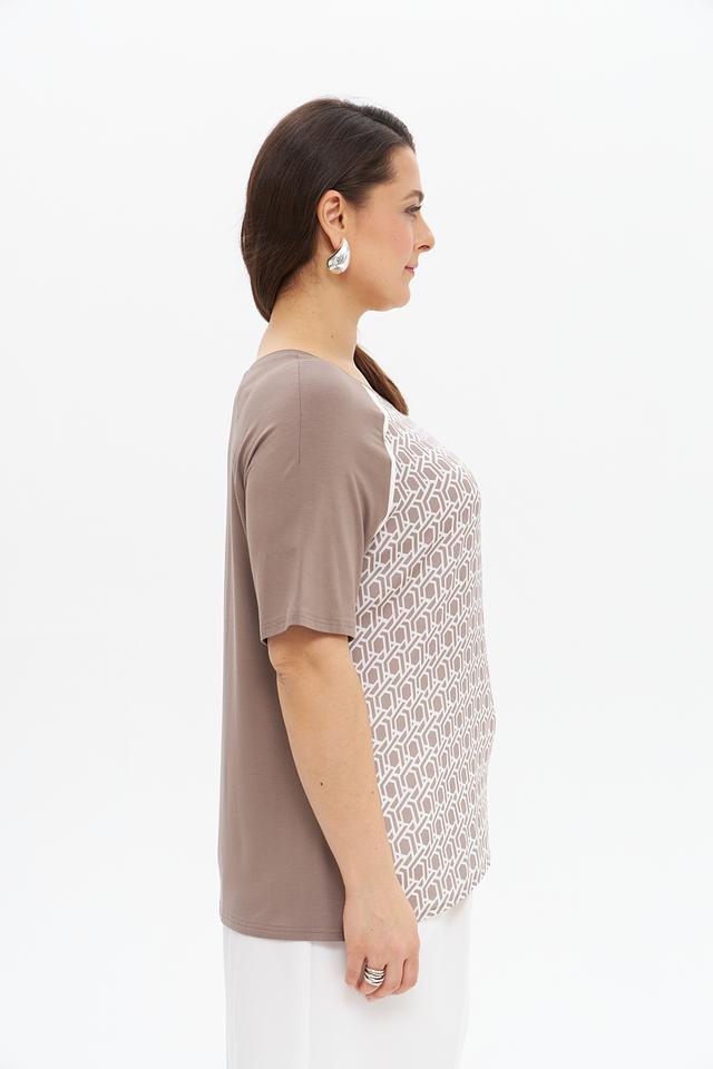 Блузка имеет свободный крой, короткие рукава и округлый вырез горловины. Передняя часть блузки украшена оригинальным геометрическим принтом в коричнево-бежевой гамме, а рукава и часть спинки выполнены в однотонном коричневом цвете.
