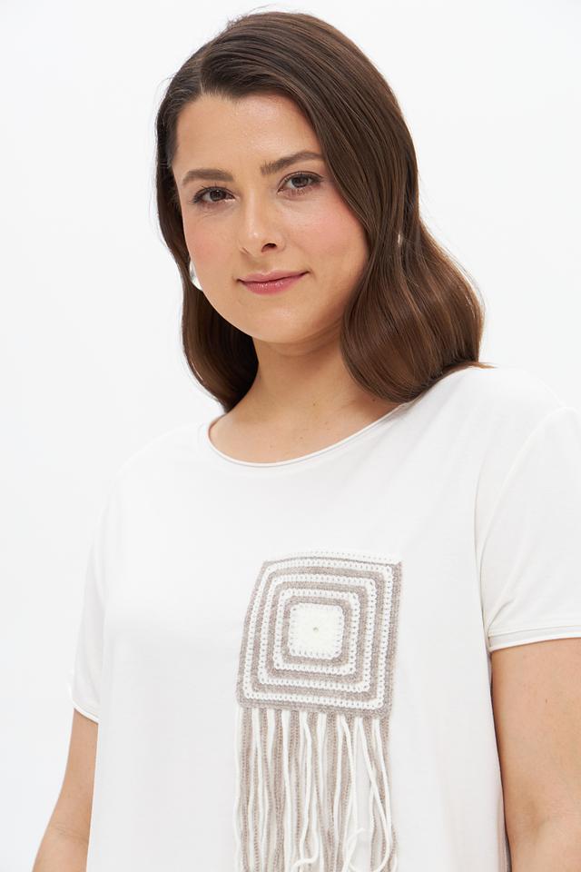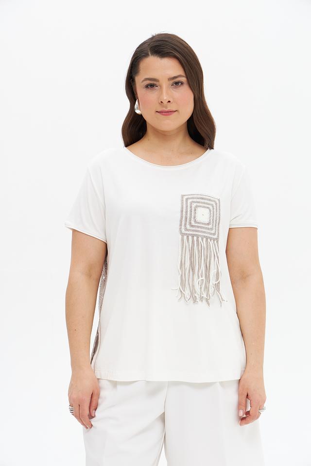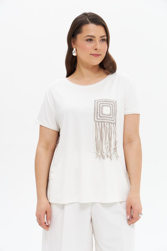 Особенностью модели является декоративный элемент в виде геометрической фигуры с бахромой, который придает ей оригинальность и изысканность. Футболка имеет свободный крой, который обеспечивает комфорт в носке.