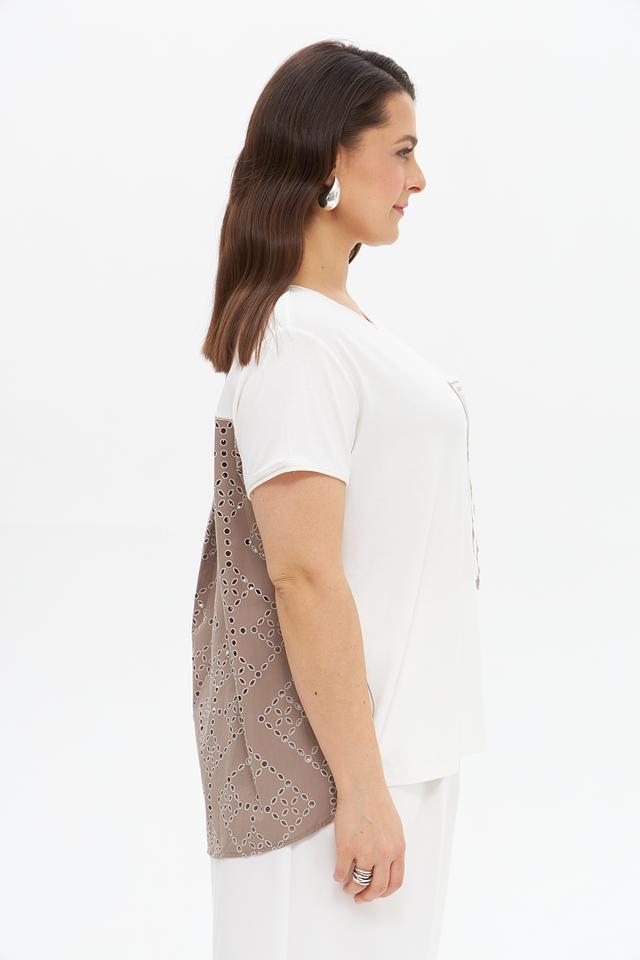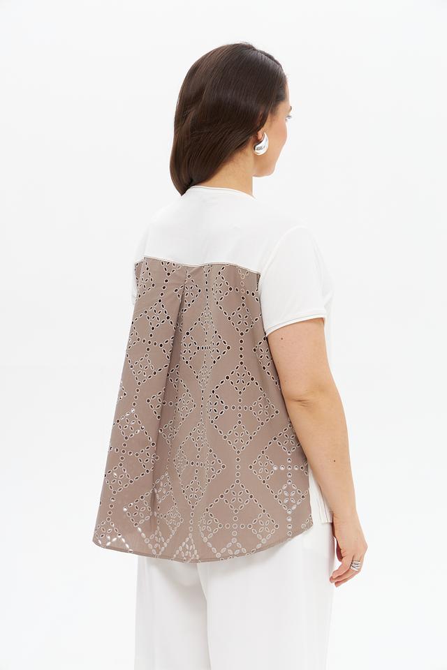 Сзади футболка выполнена из перфорированной ткани бежевого цвета, что добавляет ей легкости и воздушности.
