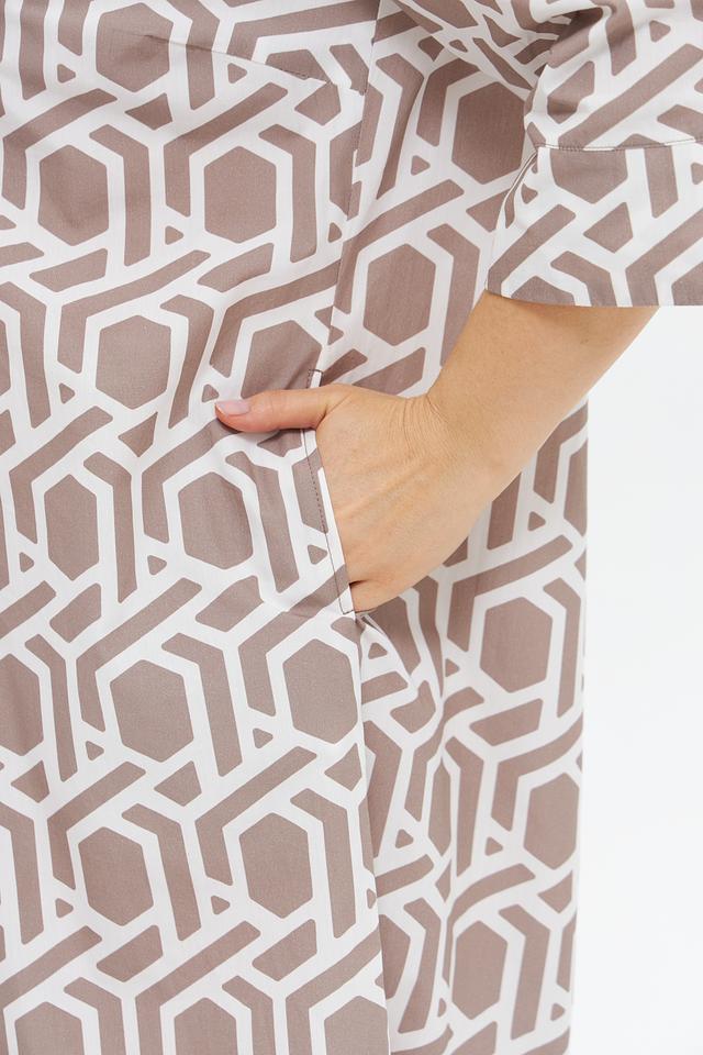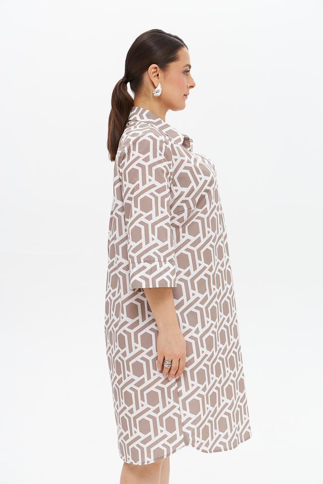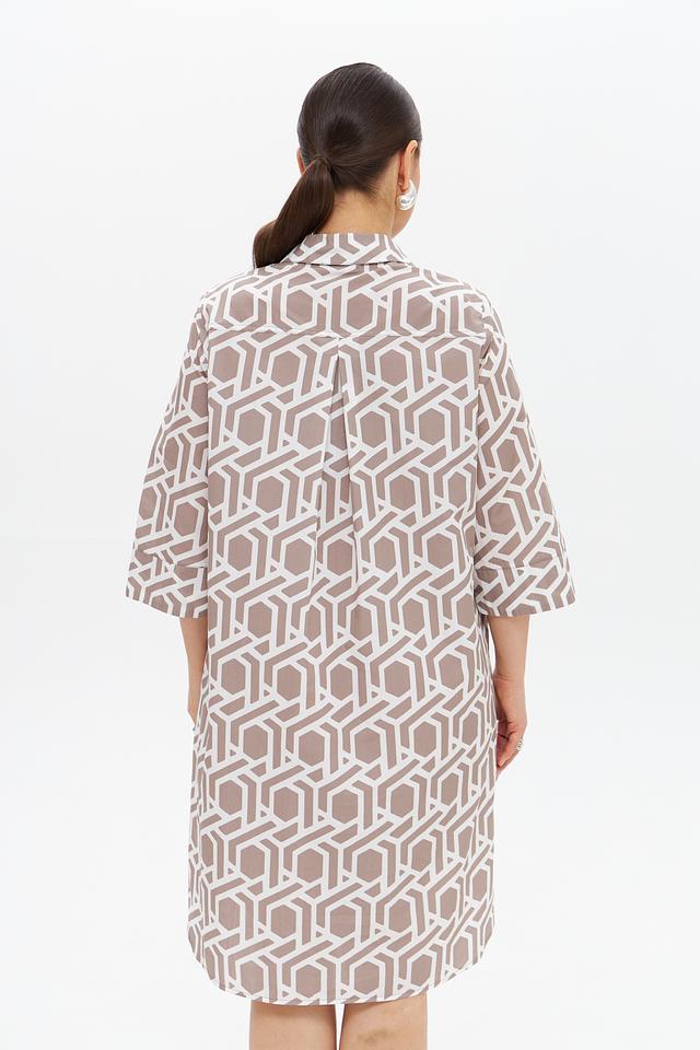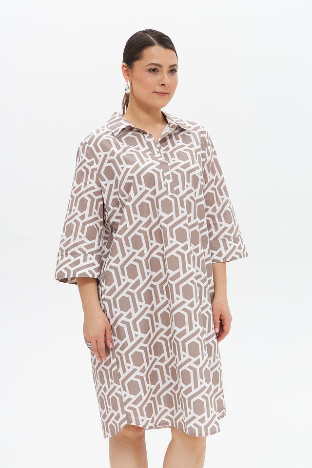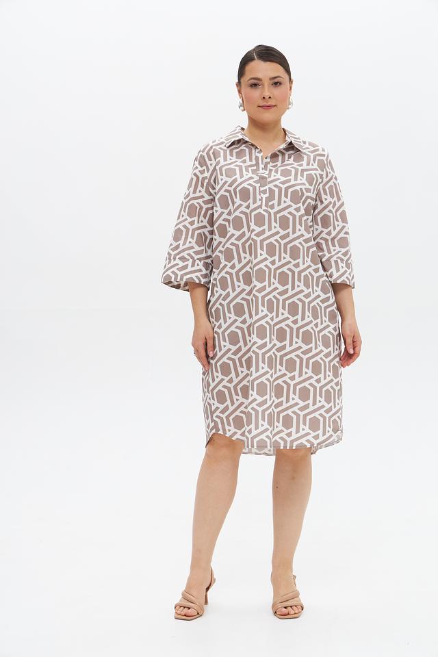 Дизайн платья представлен в бежевой цветовой гамме с геометрическим принтом, который придает ему современный и элегантный вид. Платье имеет воротник-стойку и короткие рукава, что делает его подходящим для теплой погоды. За счет пояса, который входит в комплект, можно подчеркнуть талию и создать более женственный силуэт.