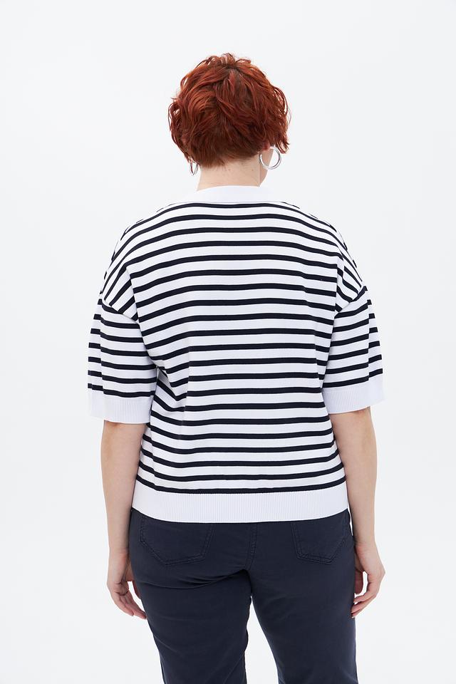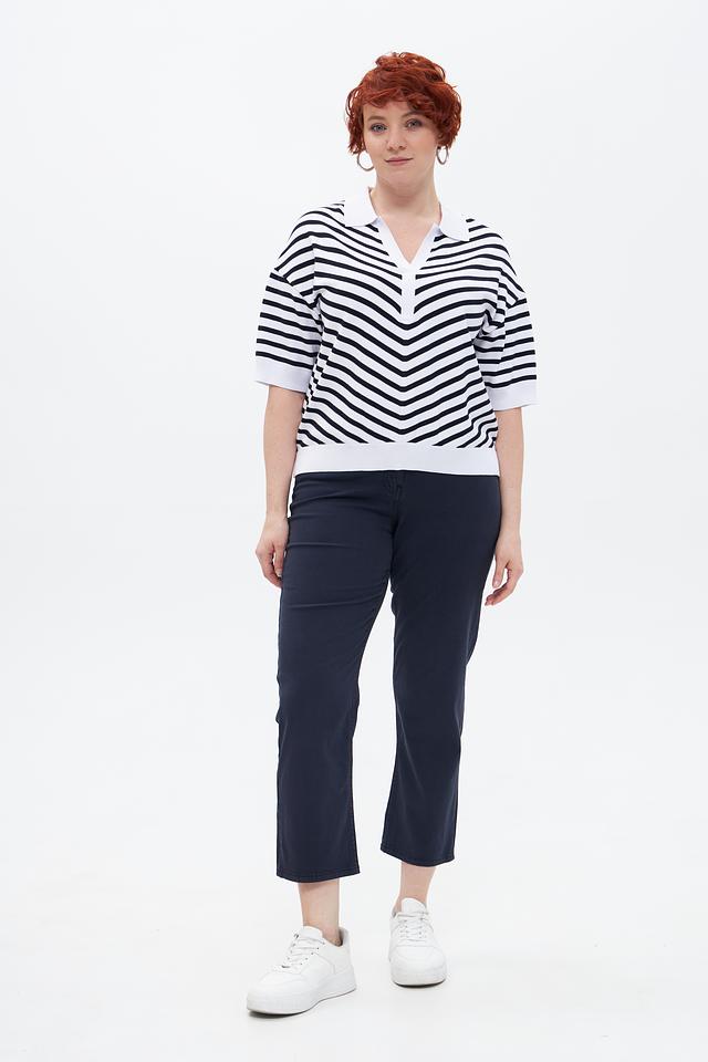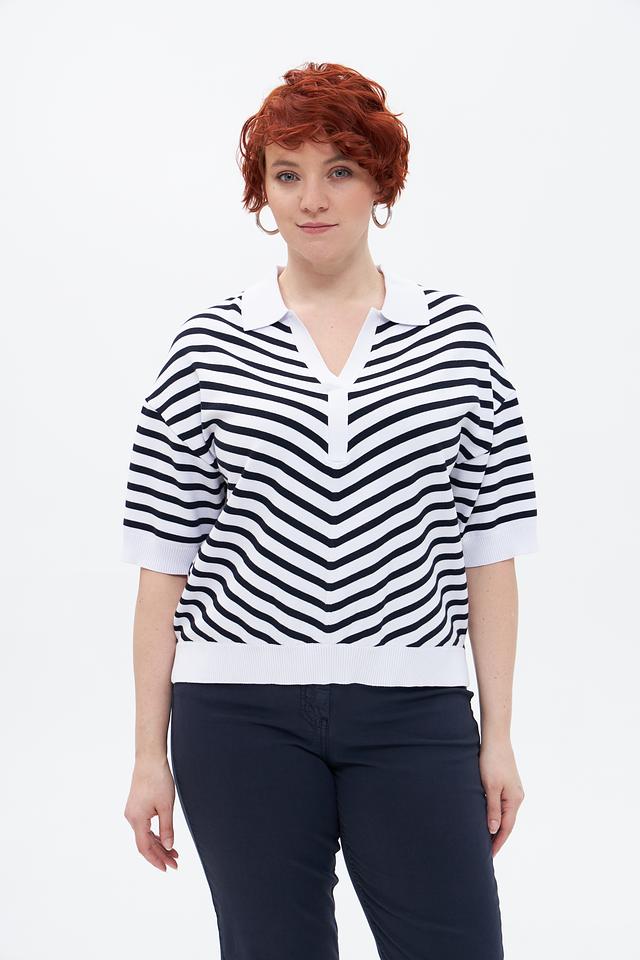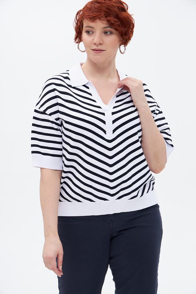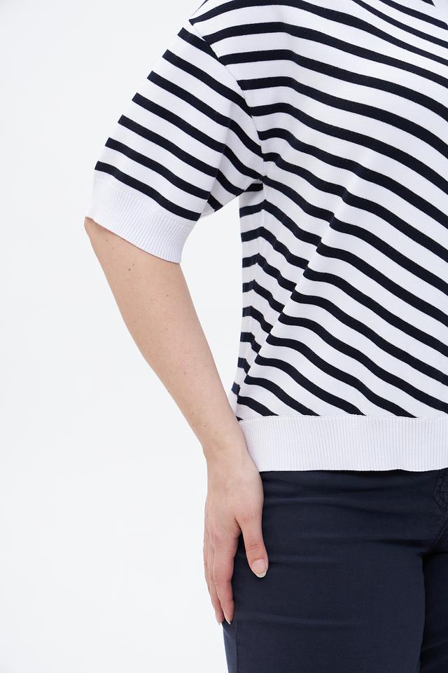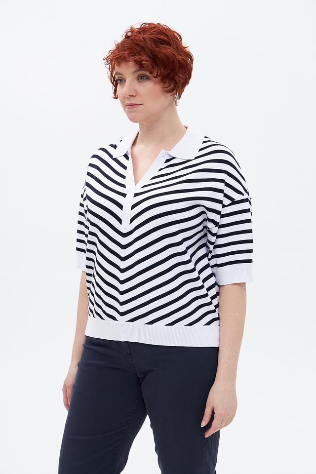Стильный пуловер Tuzzi в бело-синюю полоску с коротким рукавом и воротником поло. Изготовлен из мягкой вискозы с добавлением полиэстера для удобства в носке и поддержания формы. Состав: вискоза 72%, полиэстер 28%
