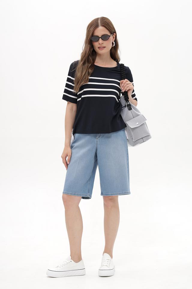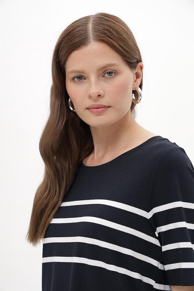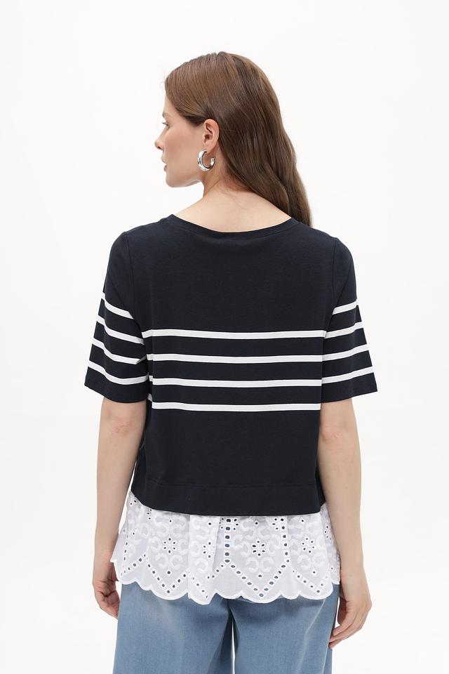 Женская футболка Tuzzi синего цвета с горизонтальными белыми полосами и кружевной вставкой. Модель выполнена из мягкой вискозы с добавлением эластана, обеспечивающей комфорт в носке. Состав: вискоза 96%, эластан 4%