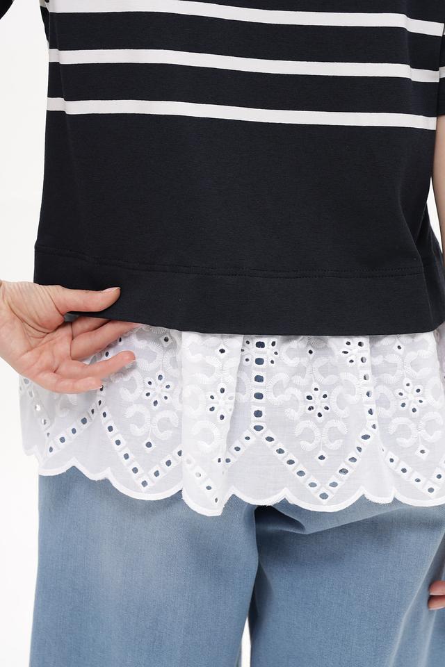 Футболка имеет свободный крой и короткий рукав, обеспечивающий свободу движений и комфорт в жаркую погоду. Оригинальной деталью является кружевная вставка по низу изделия, добавляющая романтичности и женственности.
