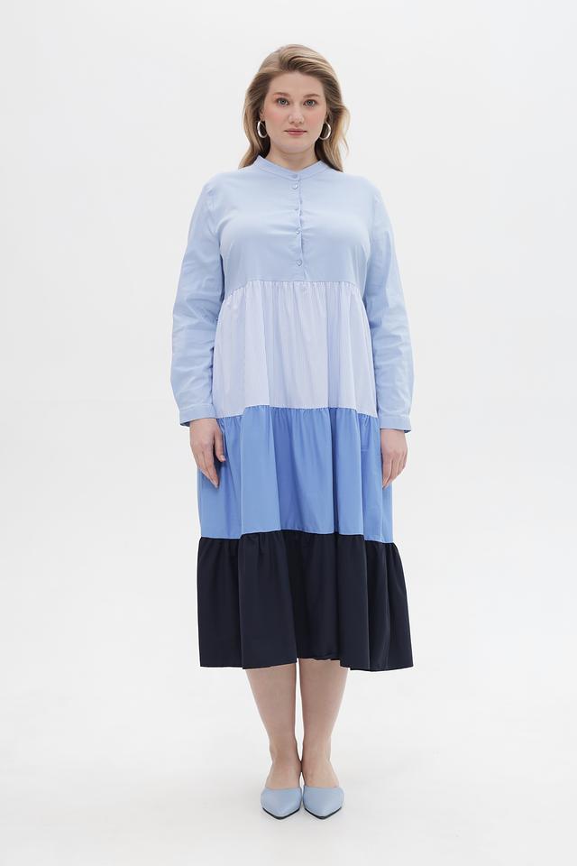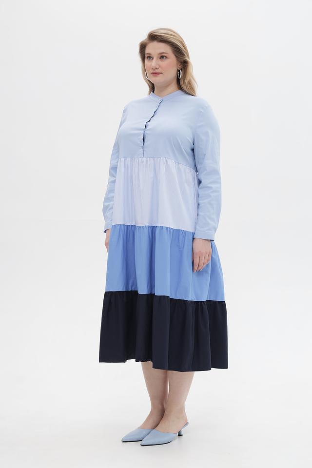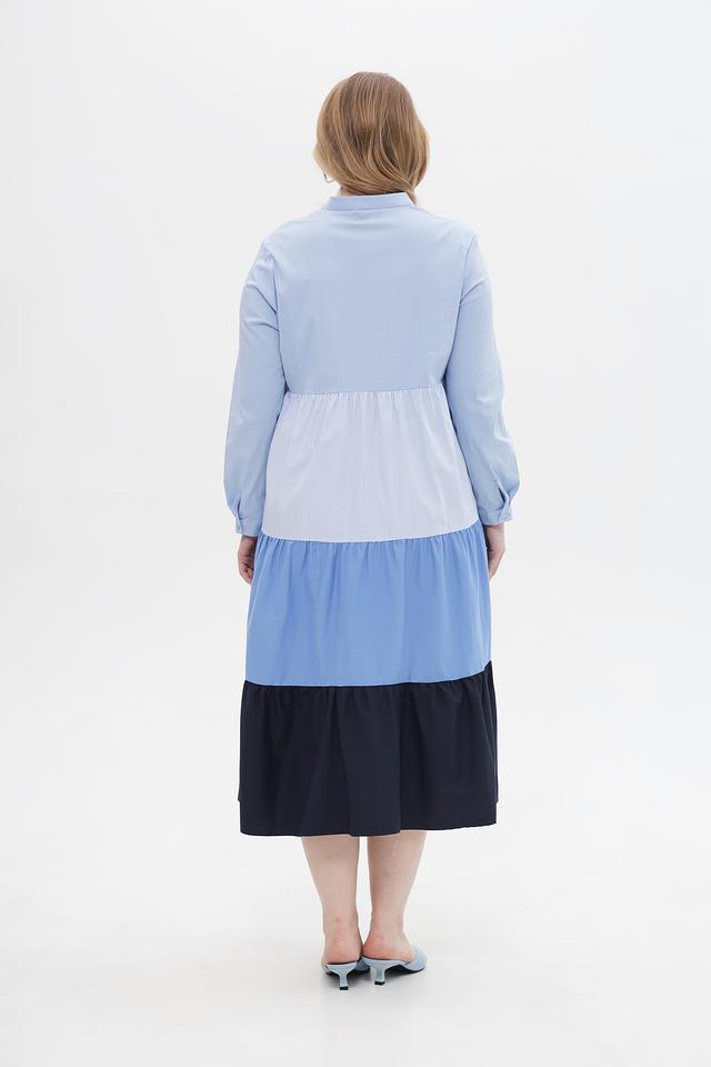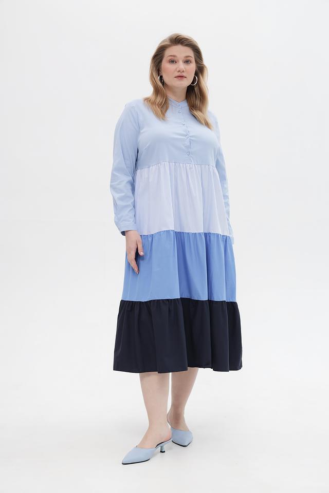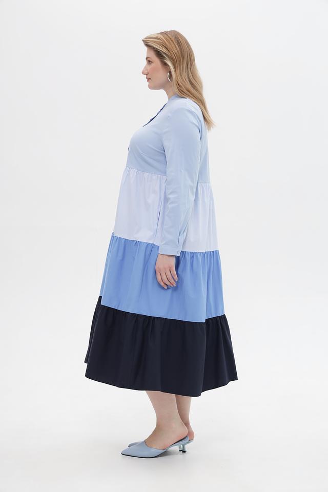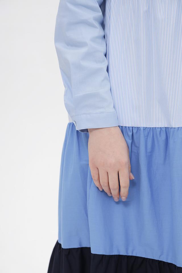 Средняя часть платья выполнена из голубой ткани, а нижняя – из чёрной, создавая эффектный контраст. Юбка платья имеет сборку, придающую ей объём и лёгкость. Платье имеет длину миди и свободный крой, обеспечивающий комфорт при носке.