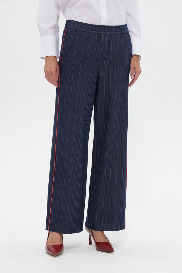 Женские брюки Tuzzi синего цвета с вертикальной полоской и красной лампасовой отделкой. Модель выполнена из мягкой вискозы с добавлением полиэстера и эластана, обеспечивающих комфорт и хорошую посадку. Состав: вискоза 60%, полиэстер 35%, эластан 5%