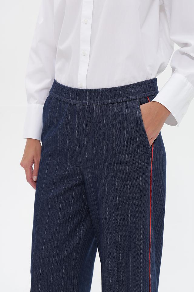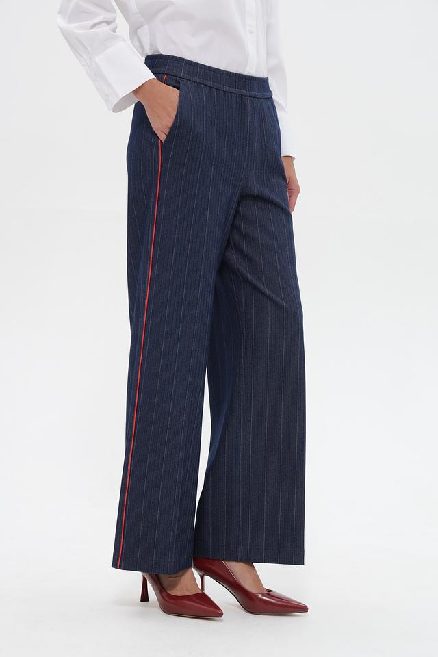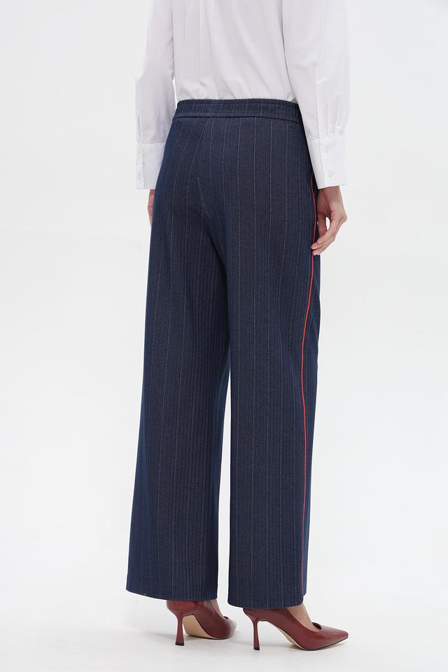 Брюки имеют классический крой с высокой посадкой и широкими штанинами, что делает их универсальными для создания различных образов. Вертикальная полоска и яркая красная лампасовая отделка по бокам придают им особый шарм и индивидуальность.