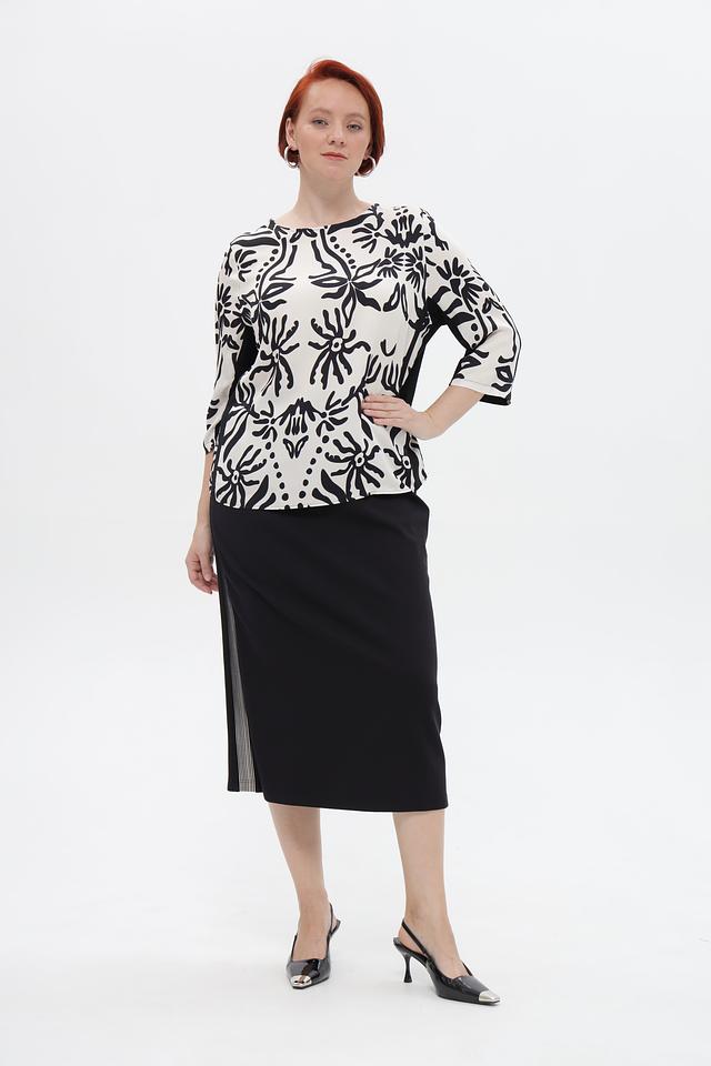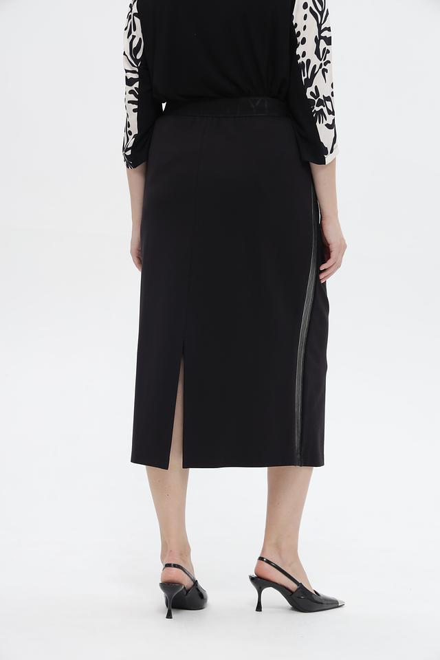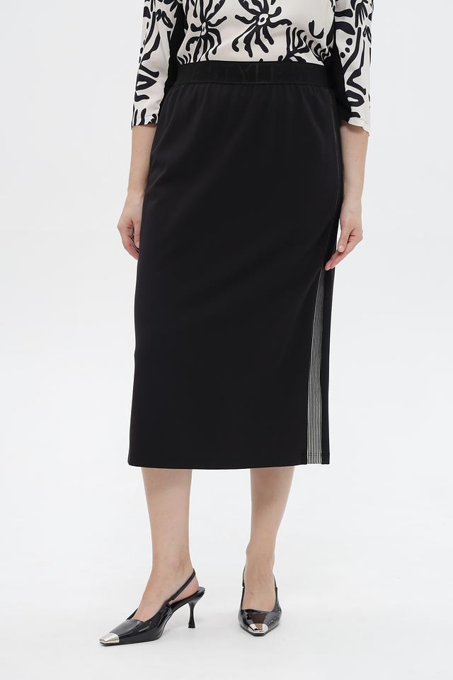 Чёрная юбка Tuzzi миди длины с декоративными полосками по бокам. Изготовлена из модала с добавлением полиэстера и эластана для комфорта и хорошей посадки. Состав: модал 55%, полиэстер 39%, эластан 6%