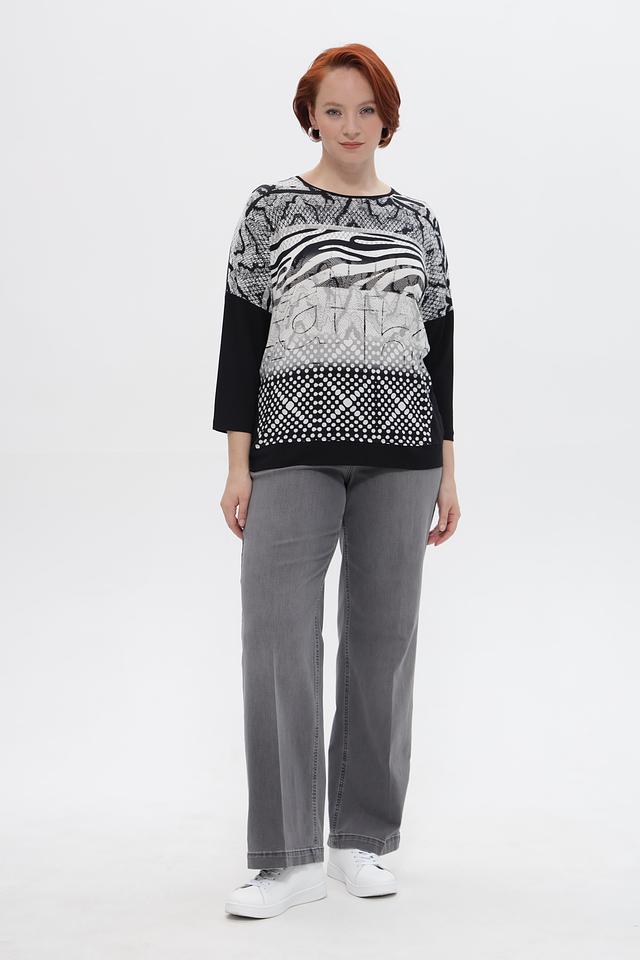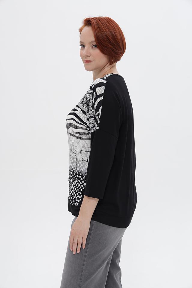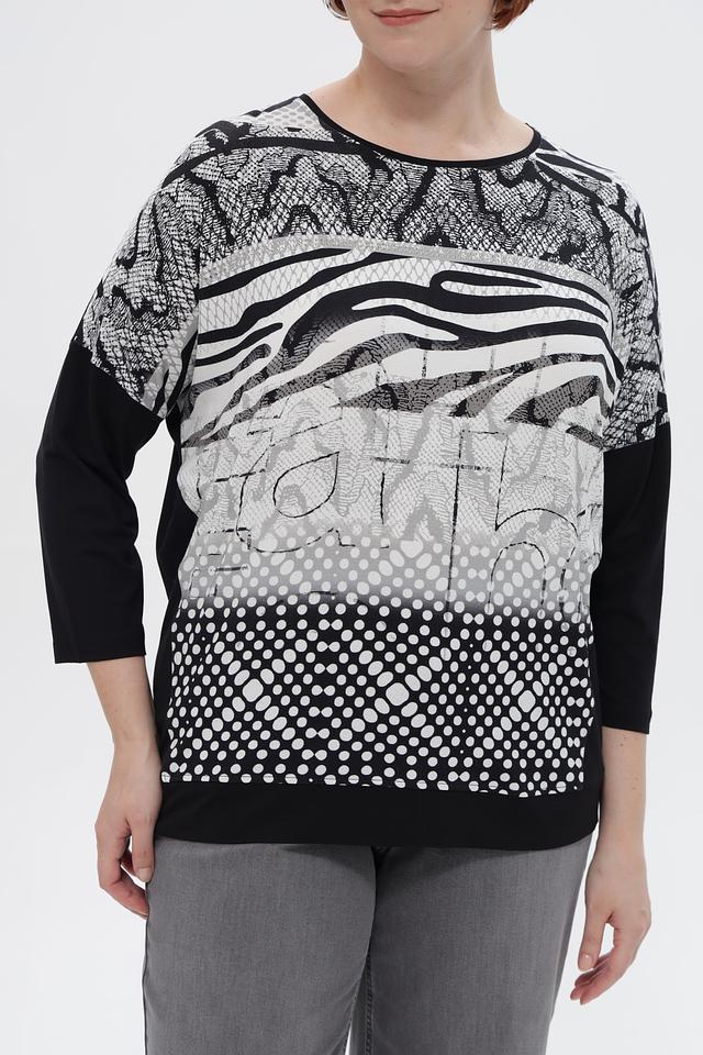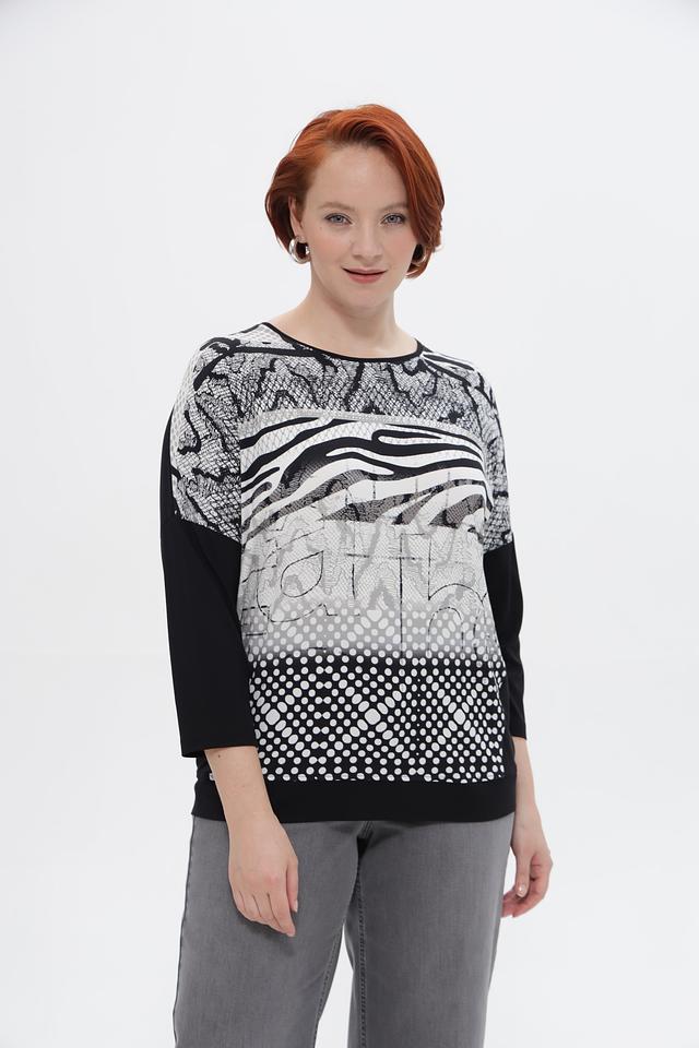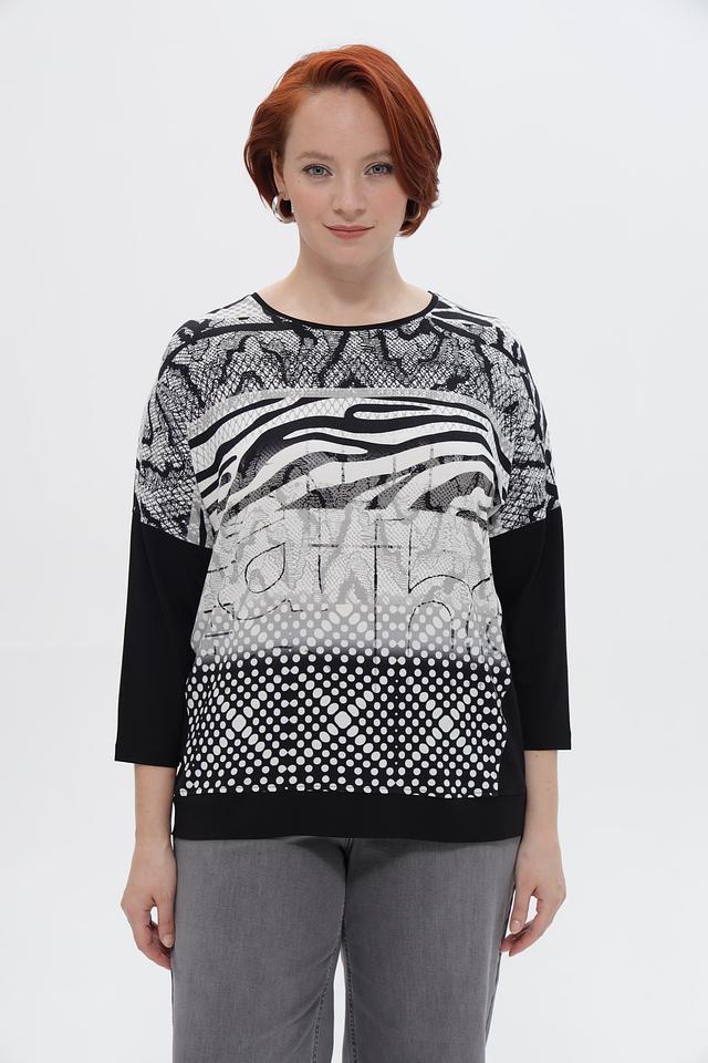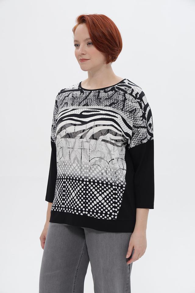 Передняя часть футболки украшена эффектным принтом, сочетающим в себе различные узоры: имитацию змеиной кожи, полоски, напоминающие зебру, и мелкий горошек. Рукава 3/4 и круглый вырез горловины придают модели лаконичный и универсальный вид.