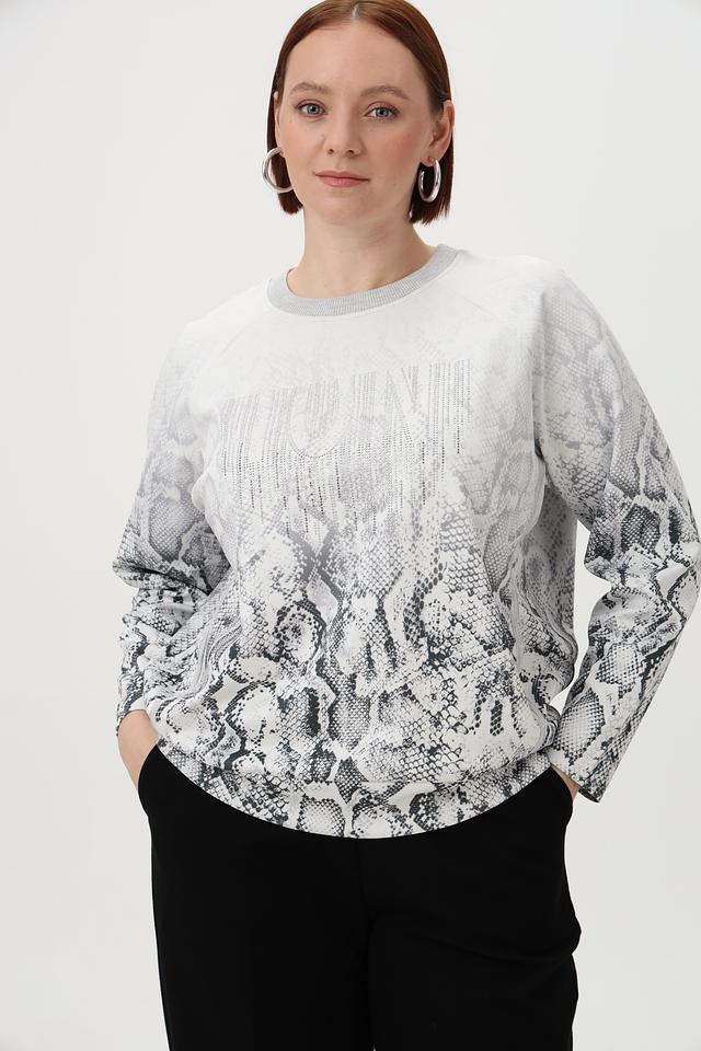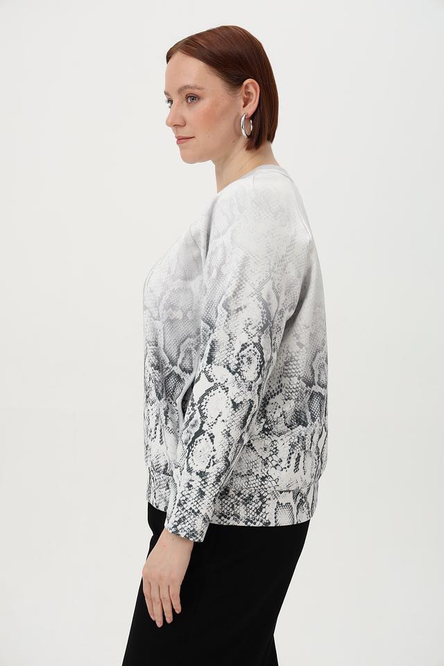 Пуловер имеет свободный крой, длинные рукава и круглый вырез. Особенностью модели является эффектный принт, имитирующий змеиную кожу, который придает ей современный и стильный вид.