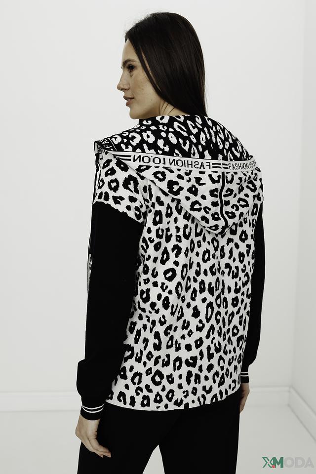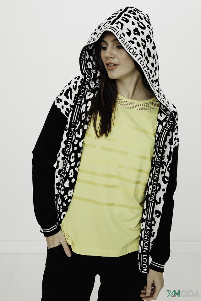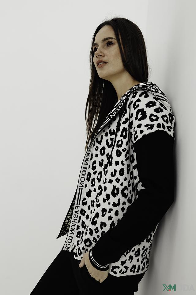 Жакет Tuzzi чёрно-белого цвета с леопардовым принтом и надписью "FASHION ICON" станет ярким акцентом вашего образа. Модель выполнена из мягкой вискозы с добавлением полиэстера, что обеспечивает комфорт и удобство в носке. Состав: вискоза 62%, полиэстер 38%