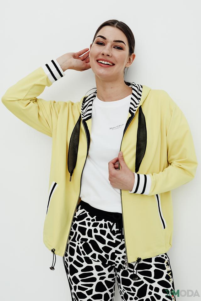 Жёлтый жакет от Tuzzi с капюшоном и застежкой-молнией станет отличным дополнением к вашему гардеробу. Модель выполнена из мягкой ткани с добавлением хлопка и модала, что обеспечивает комфорт в носке. Декоративные полосы на рукавах и капюшоне придают образу спортивный шик. Состав: хлопок 45%, модал 45%, эластан 10%