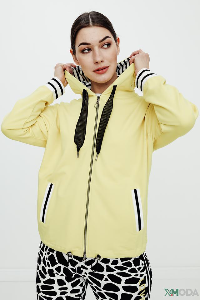 Модель имеет свободный крой, который не сковывает движений и обеспечивает комфорт в течение всего дня. Декоративные полосы на рукавах и по низу изделия придают образу динамичный и современный вид. Жакет выполнен из высококачественного материала, сочетающего в себе хлопок, модал и эластан, что обеспечивает мягкость, приятные тактильные ощущения и хорошую посадку по фигуре.