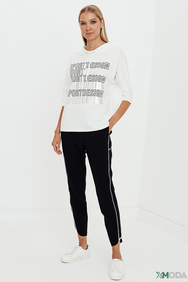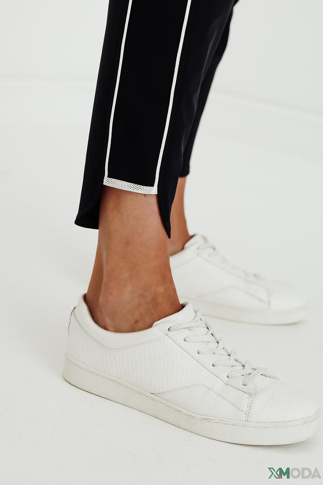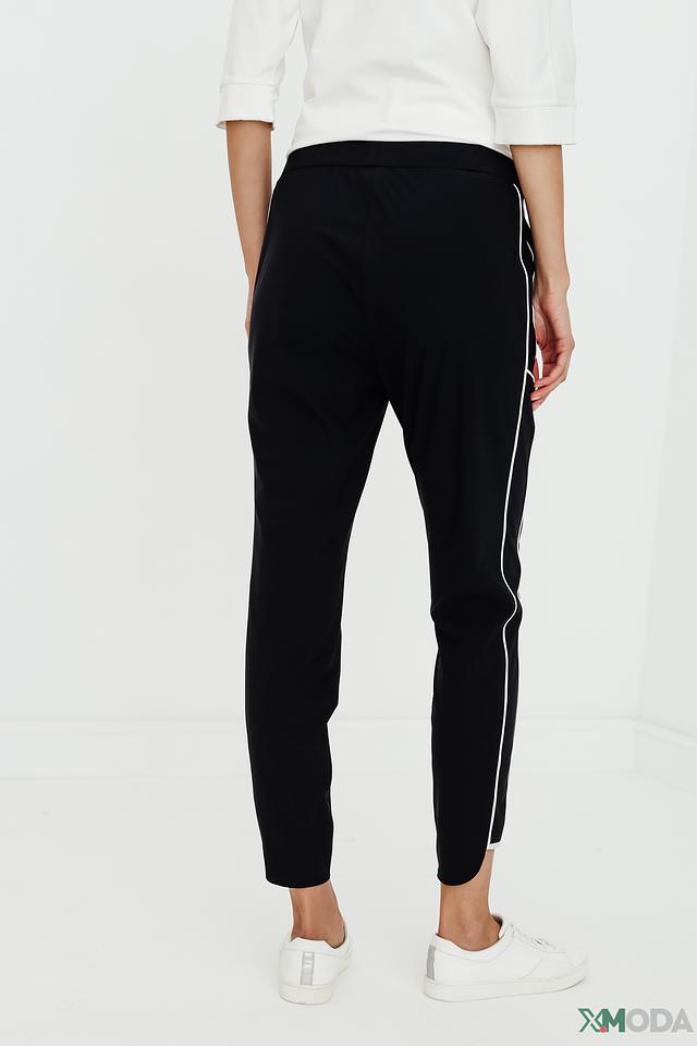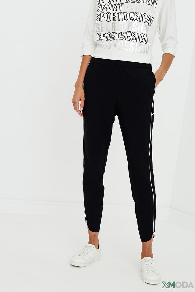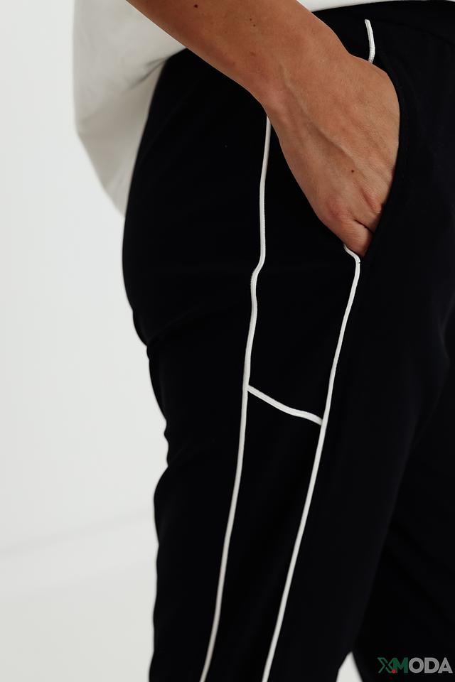 Дизайн брюк дополнен контрастными белыми полосами по бокам, которые придают им спортивный и современный вид. Эластичный пояс с регулирующим шнурком обеспечивает надежную фиксацию и комфортную посадку. Брюки идеально подойдут для занятий спортом, активного отдыха или повседневной носки.