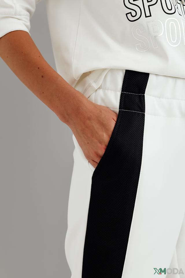 Представляем вашему вниманию стильные спортивные брюки от бренда Tuzzi. Эта модель выполнена в белом цвете с контрастными черными лампасами по бокам, что придает ей современный и динамичный вид.