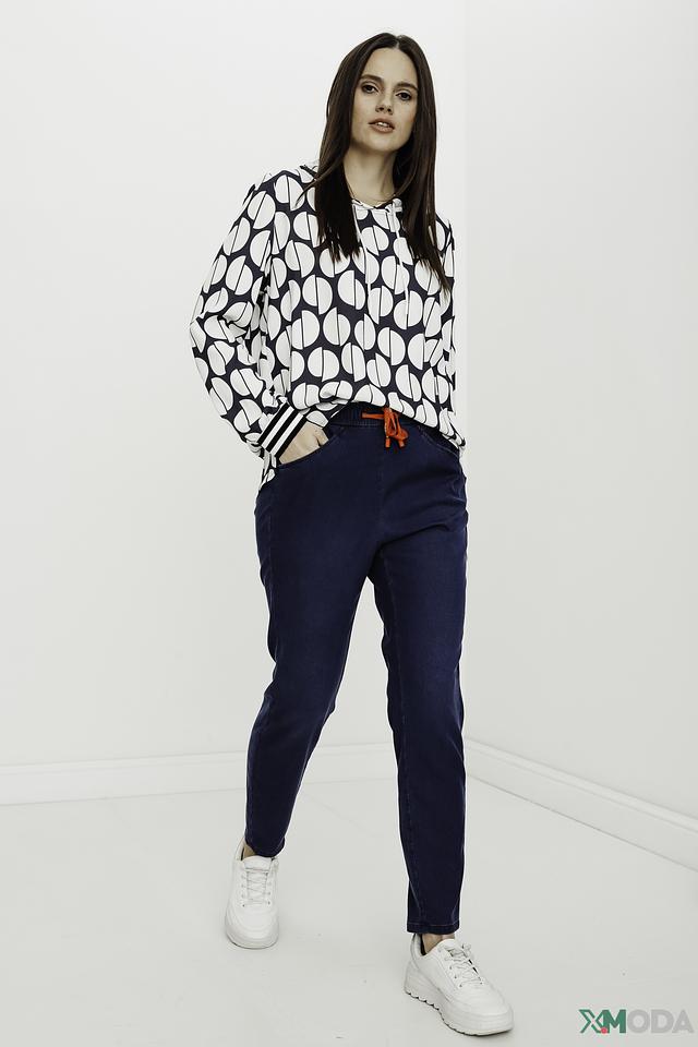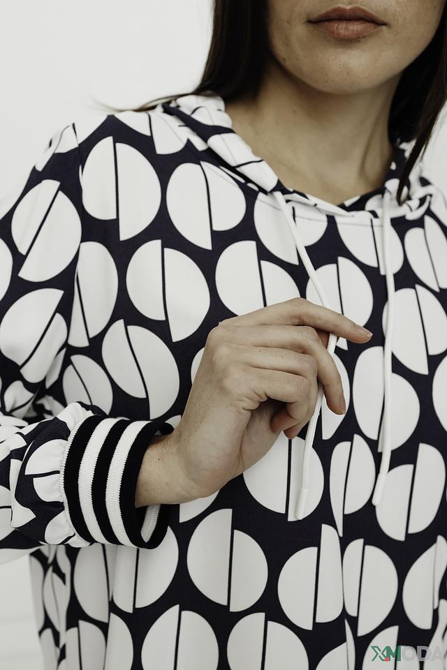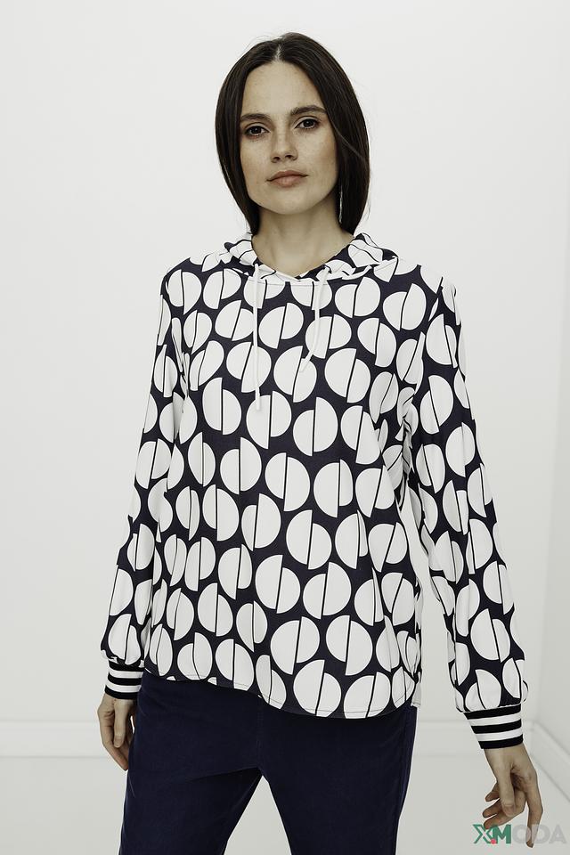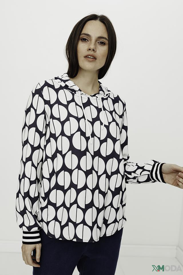 Стильная блуза Tuzzi синего цвета с оригинальным принтом в виде горошка и удобным капюшоном. Модель с длинными рукавами и манжетами на резинке, идеально подходит для создания повседневных образов. Состав: вискоза 100%