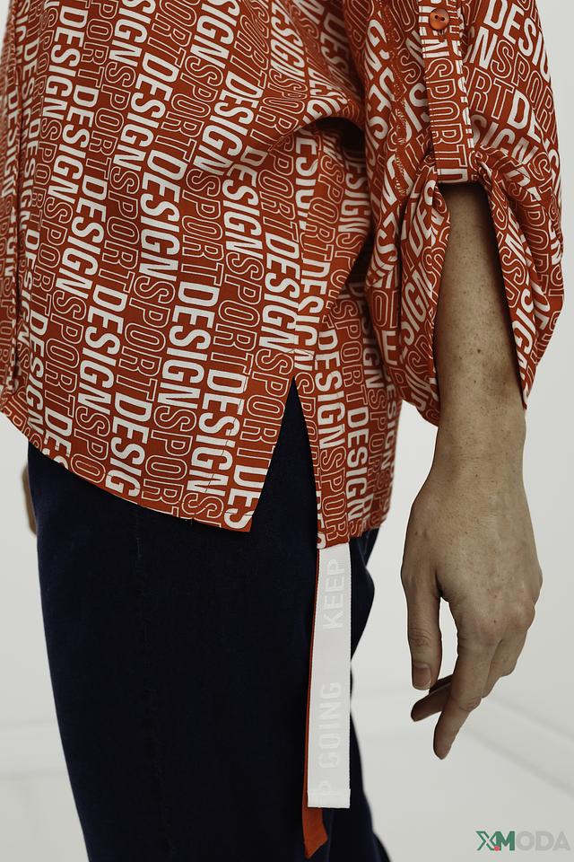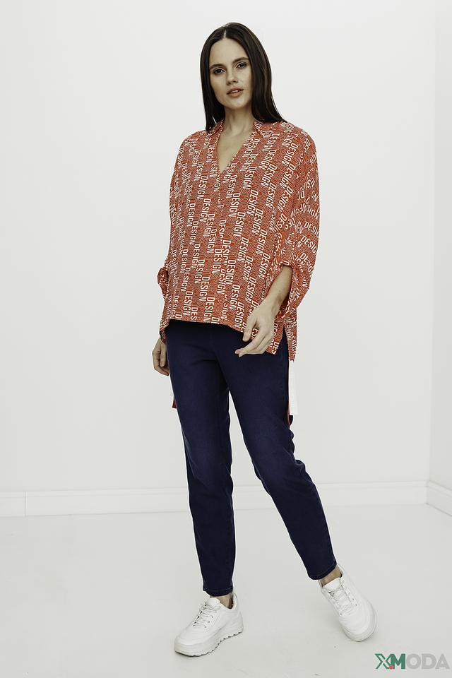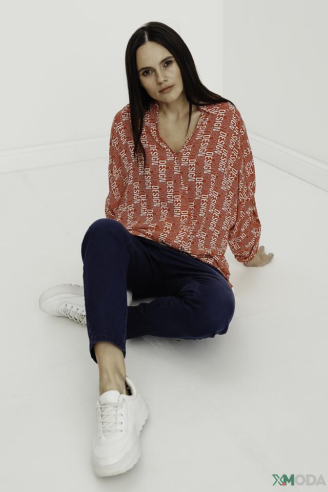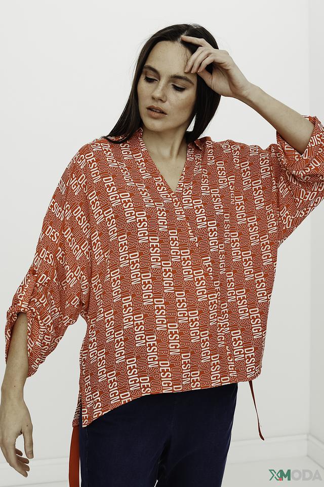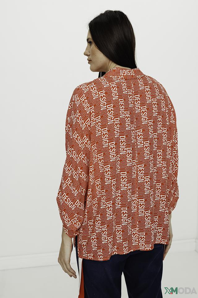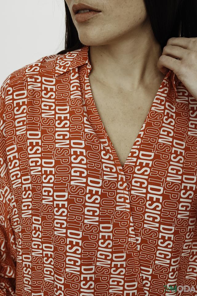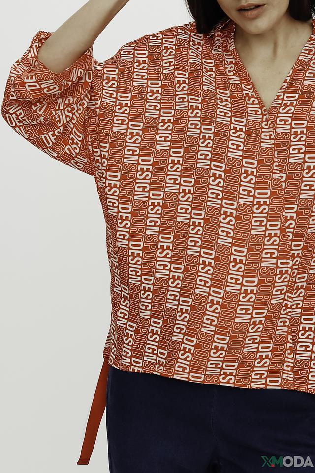 Блуза имеет свободный крой, который не сковывает движений, и рукава 3/4, идеально подходящие для теплой погоды. Главная особенность модели – эффектный принт "Design", выполненный в красных тонах. Он добавляет блузе динамичности и оригинальности.