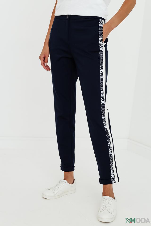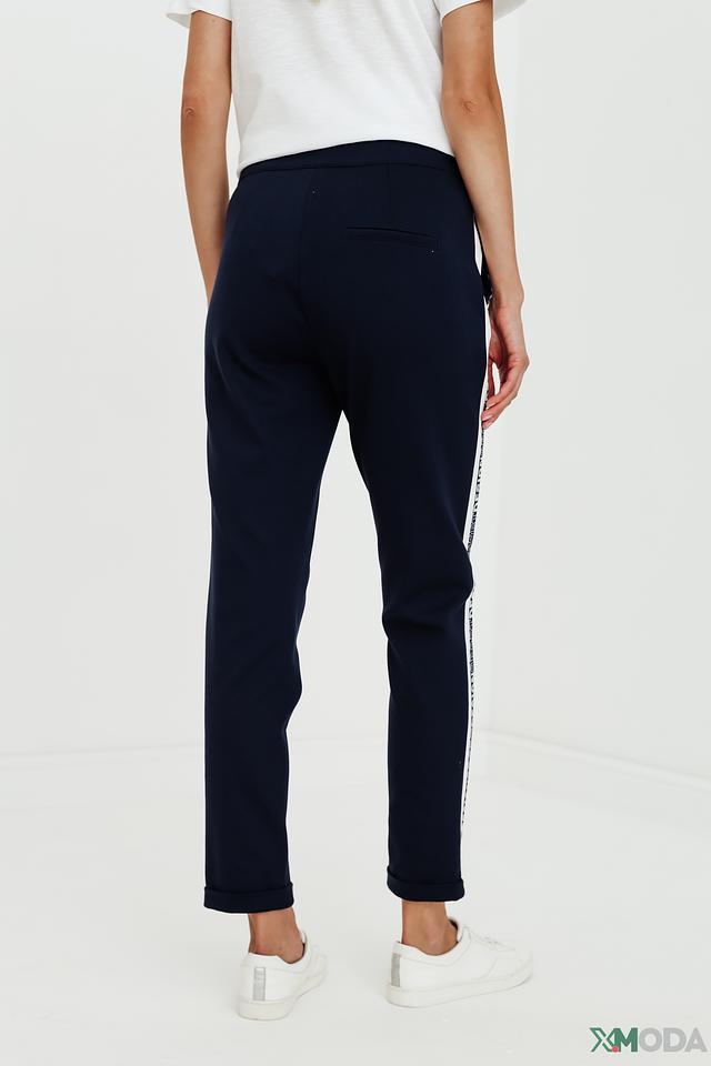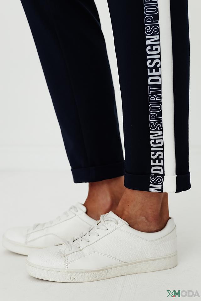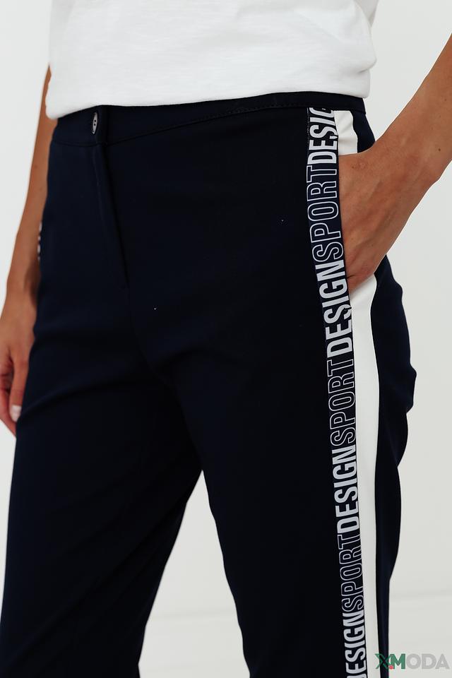Брюки имеют прямой крой и зауженный книзу силуэт, что придает им современный вид. Отличительной особенностью модели является широкая полоска, проходящая вдоль штанины, выполненная в белом цвете с надписью.