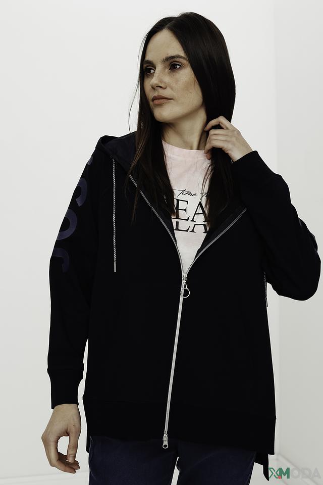 Чёрный кардиган от Tuzzi с оригинальной надписью на спине станет стильным дополнением к вашему гардеробу. Модель на молнии с капюшоном выполнена из мягкого хлопка с добавлением полиэстера и эластана. Состав: хлопок 75%, полиэстер 20%, эластан 5%