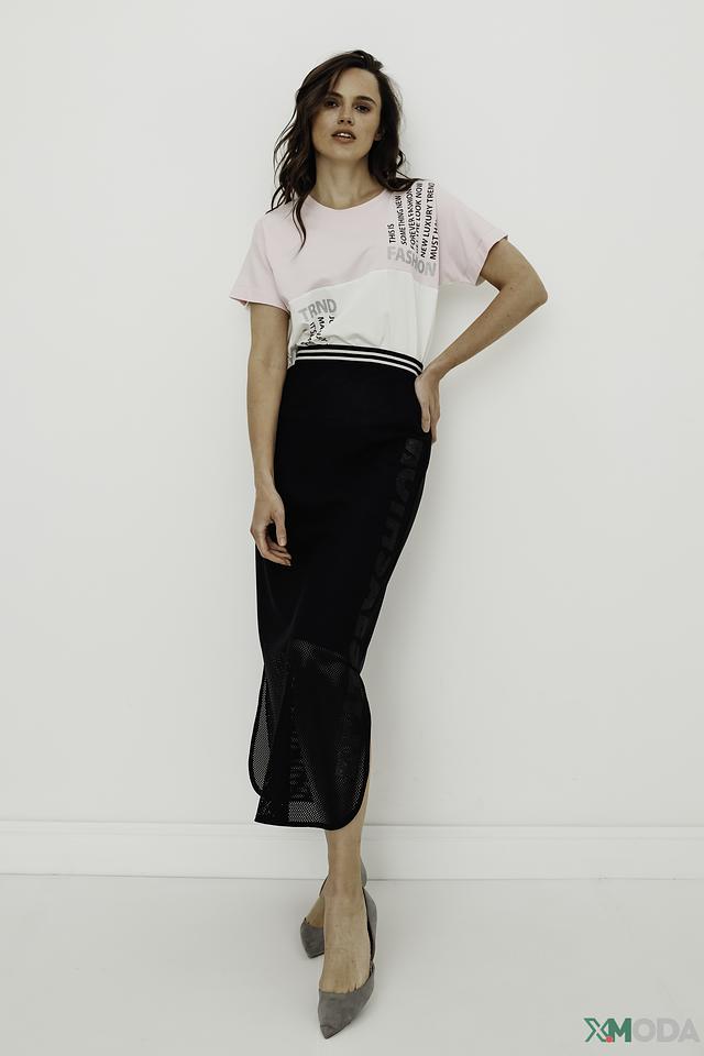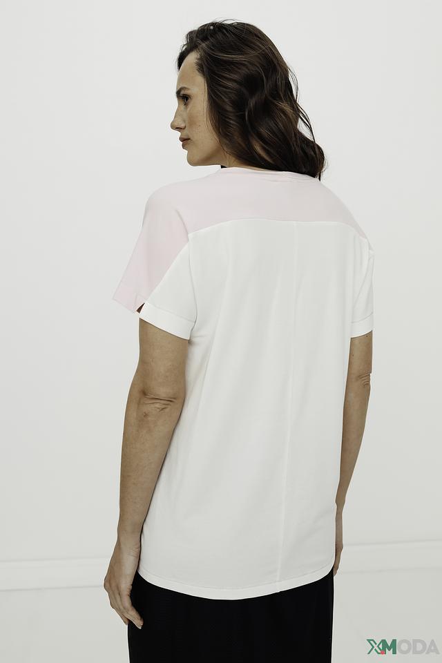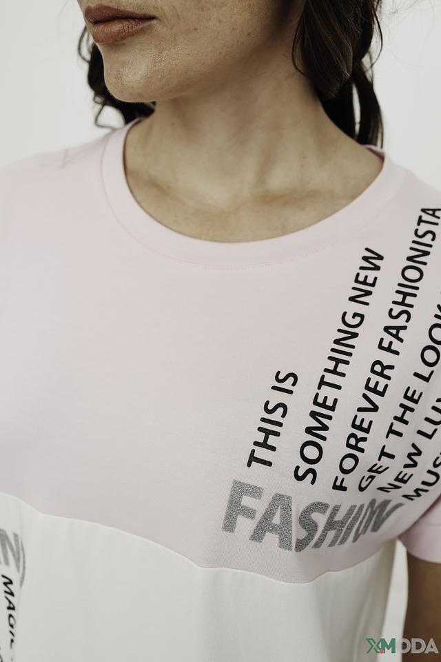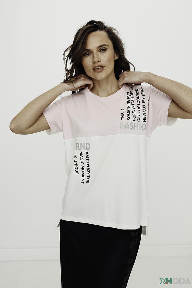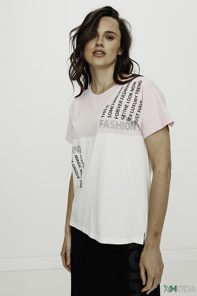 Футболка выполнена в белом цвете с вставками светло-розового оттенка. Передняя часть украшена ярким принтом с надписями и графическими элементами, что придает ей индивидуальность.