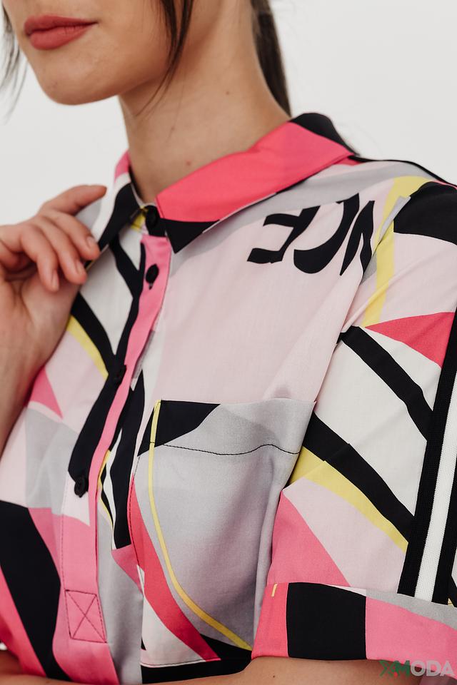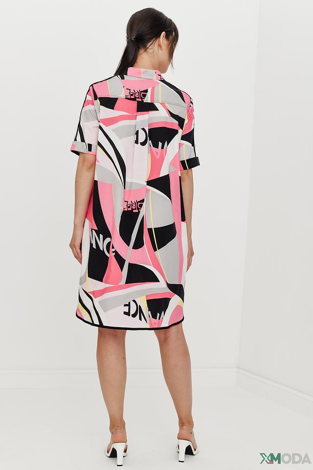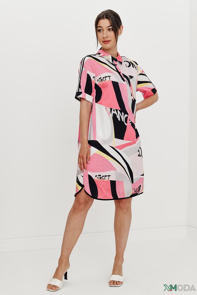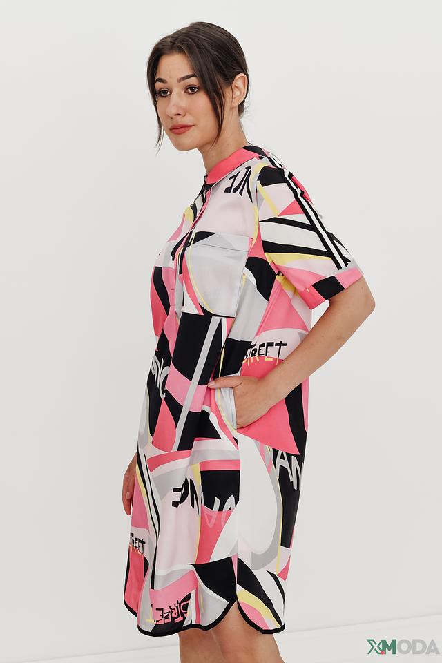 Дизайн платья представлен ярким абстрактным принтом, сочетающим в себе различные геометрические фигуры и надписи в черном, розовом и белом цветах. Крой платья свободный, что обеспечивает свободу движений и комфорт в течение всего дня. Модель имеет короткие рукава и воротник рубашечного типа, что придает ей более структурированный вид.