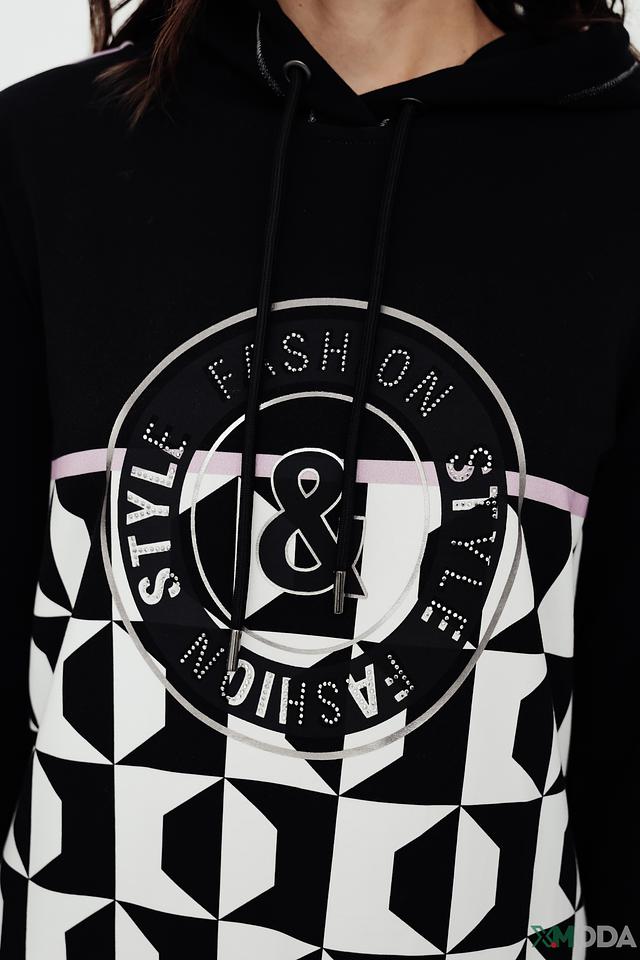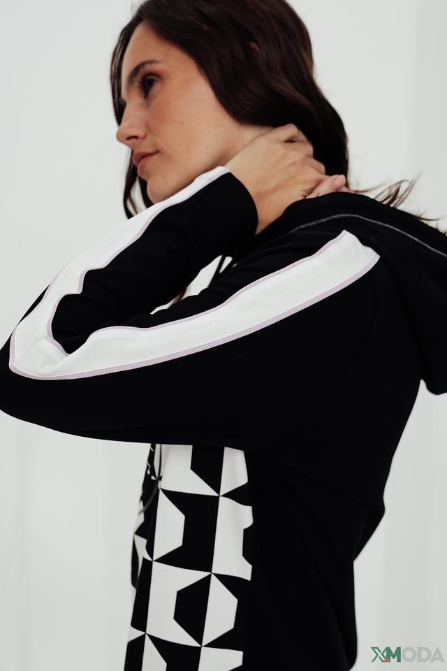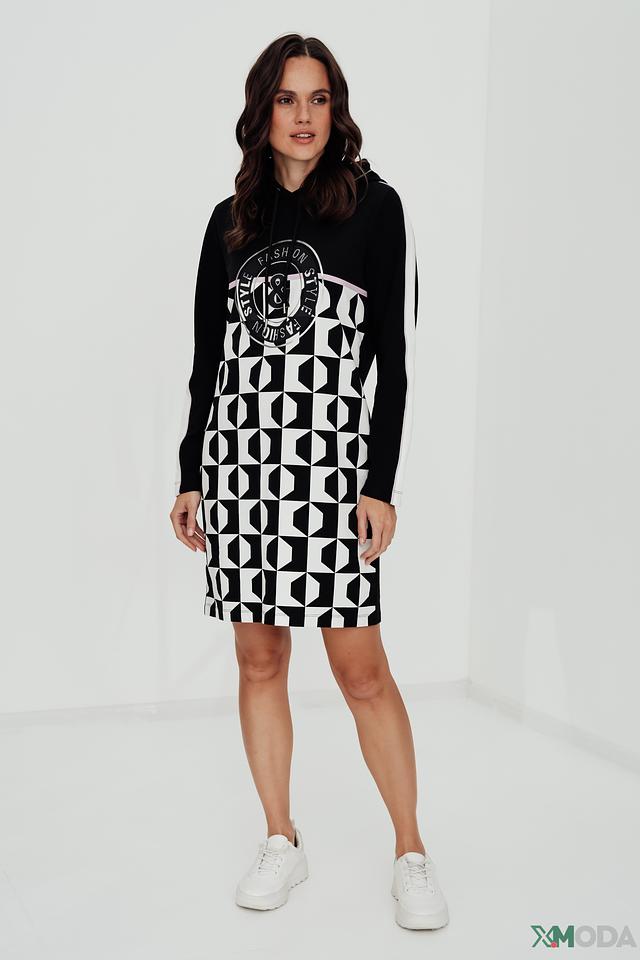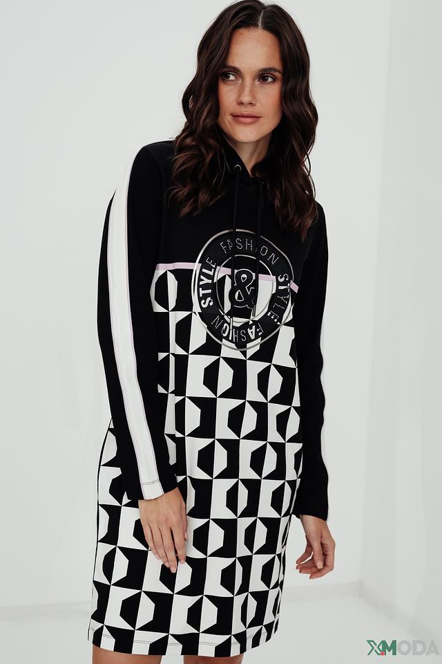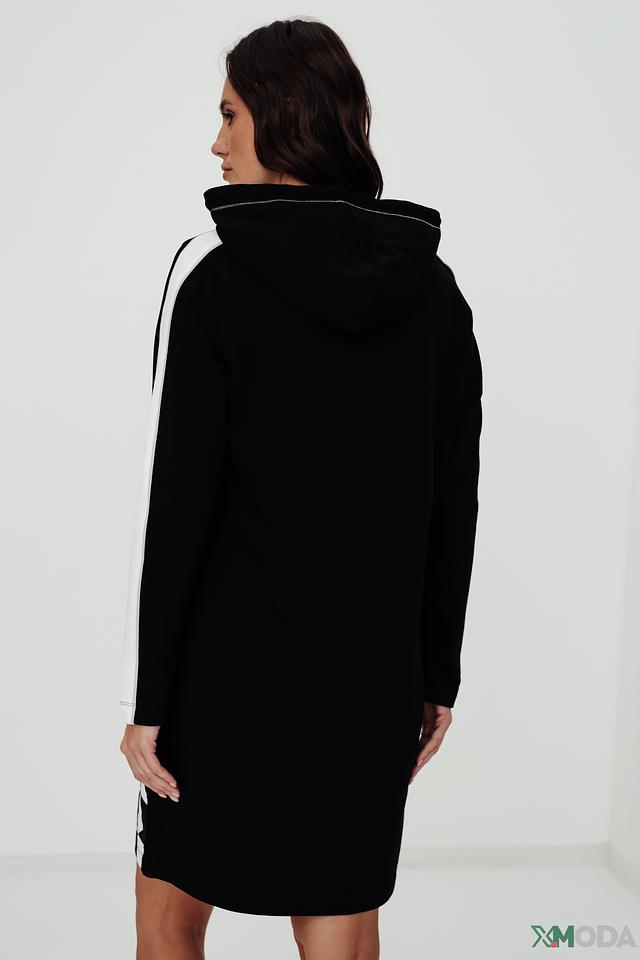 Платье имеет удобный капюшон и выполнен из приятной к телу ткани, состоящей из 97% хлопка и 3% эластана. Белые полосы на рукавах добавляют динамики образу. Крой платья свободный, что обеспечивает комфорт при носке.