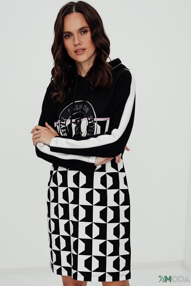 Это платье от бренда Tuzzi станет отличным дополнением к вашему гардеробу. Основной цвет платья – чёрный, а нижняя часть украшена контрастным геометрическим принтом в белых тонах.