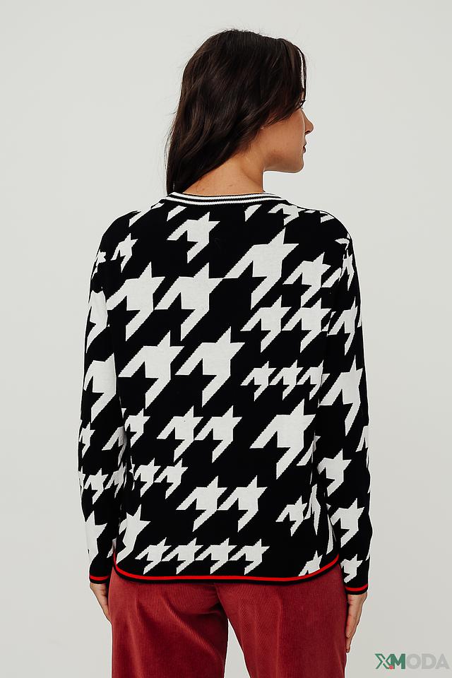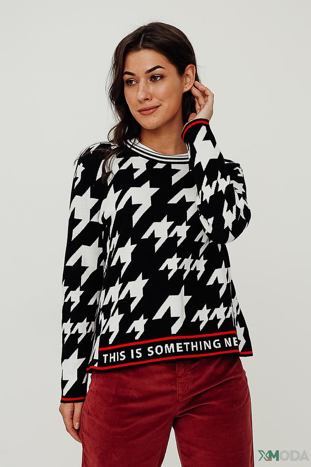 Женский пуловер Tuzzi чёрно-белого цвета с классическим узором "гусиная лапка" и яркой надписью на груди. Изготовлен из мягкого хлопка, обеспечивающего комфорт в носке. Состав: хлопок 100%