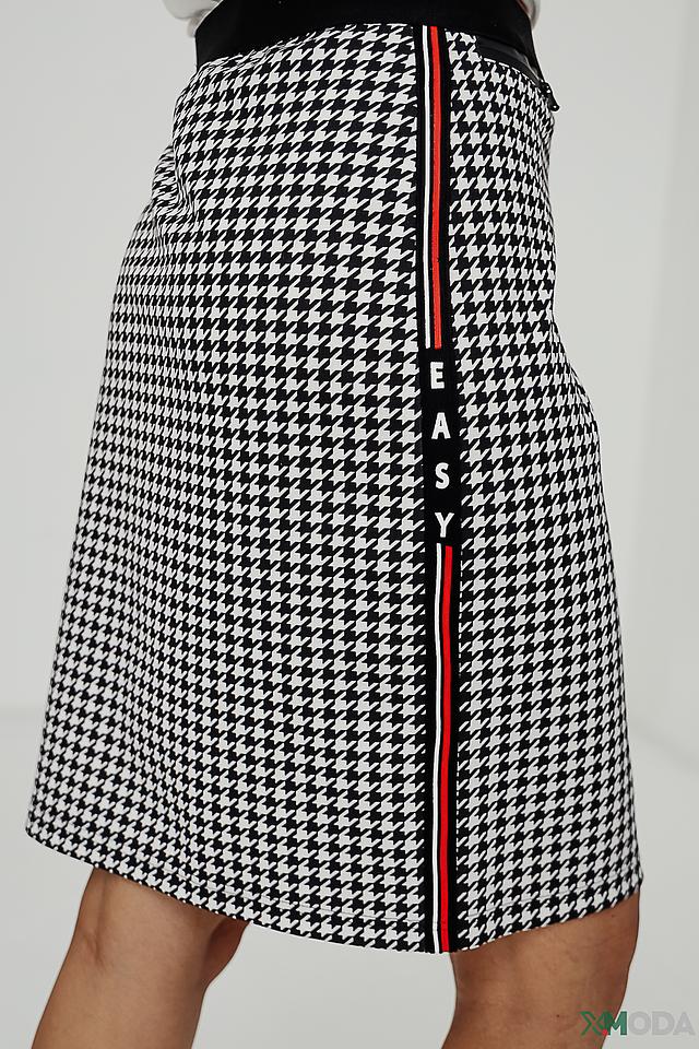 Юбка имеет прямой крой, который подчеркивает фигуру, и длину до колена. Эластичный пояс обеспечивает комфортную посадку. Декоративная красная полоса с надписью "EASY" вдоль бокового шва добавляет юбке оригинальности и динамики.