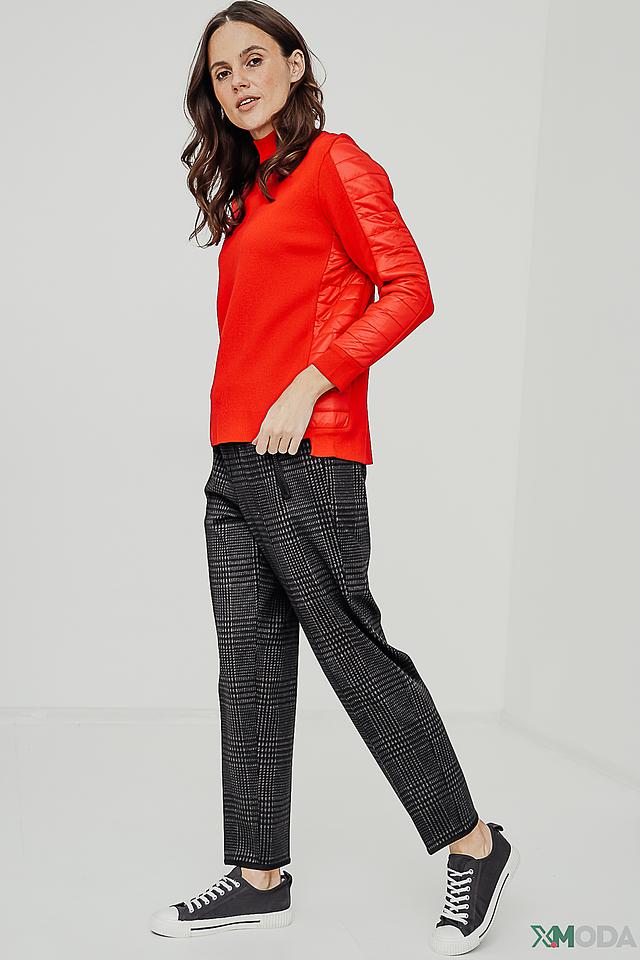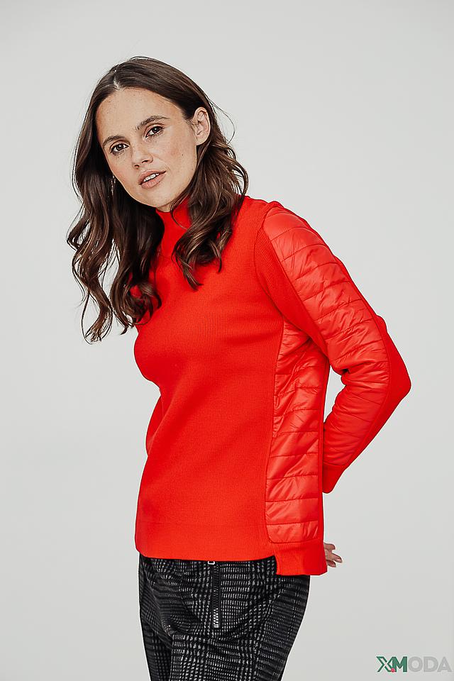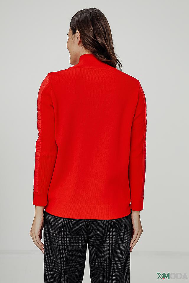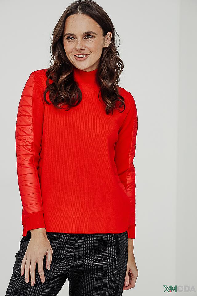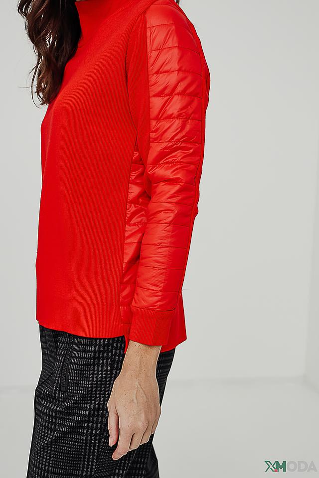 Основной цвет водолазки – насыщенный красный. Рукава декорированы контрастными красными вставками из стеганой ткани, что придает модели оригинальный и современный вид. Высокий воротник-стойка подчеркивает элегантность силуэта.
