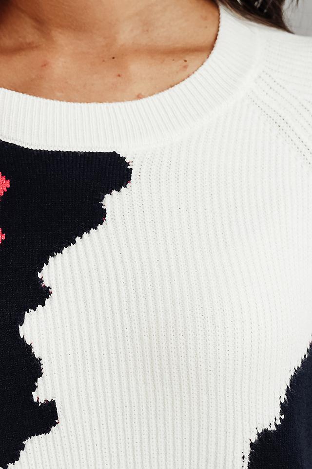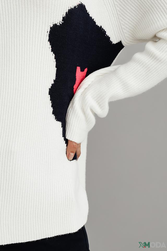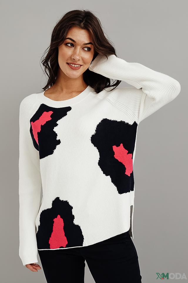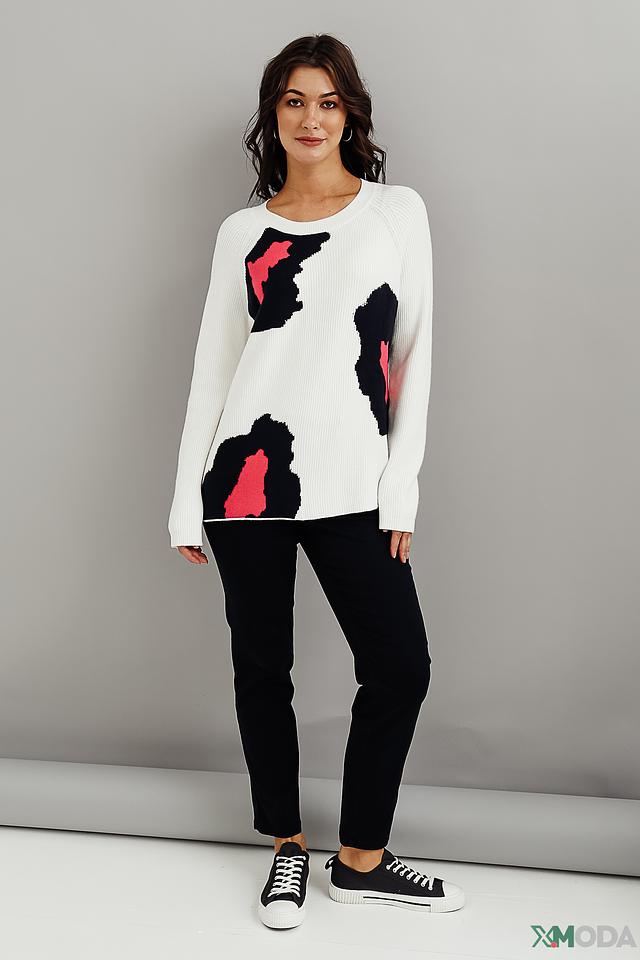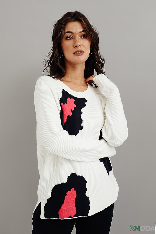 Этот стильный пуловер от Tuzzi выполнен в белом цвете и украшен оригинальным абстрактным рисунком, сочетающим в себе чёрные и розовые элементы. Модель имеет свободный крой и круглый вырез горловины, что делает её универсальной и подходящей для различных образов.