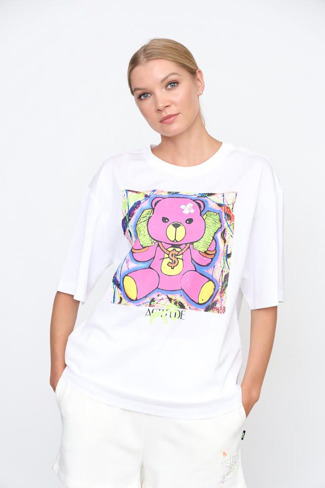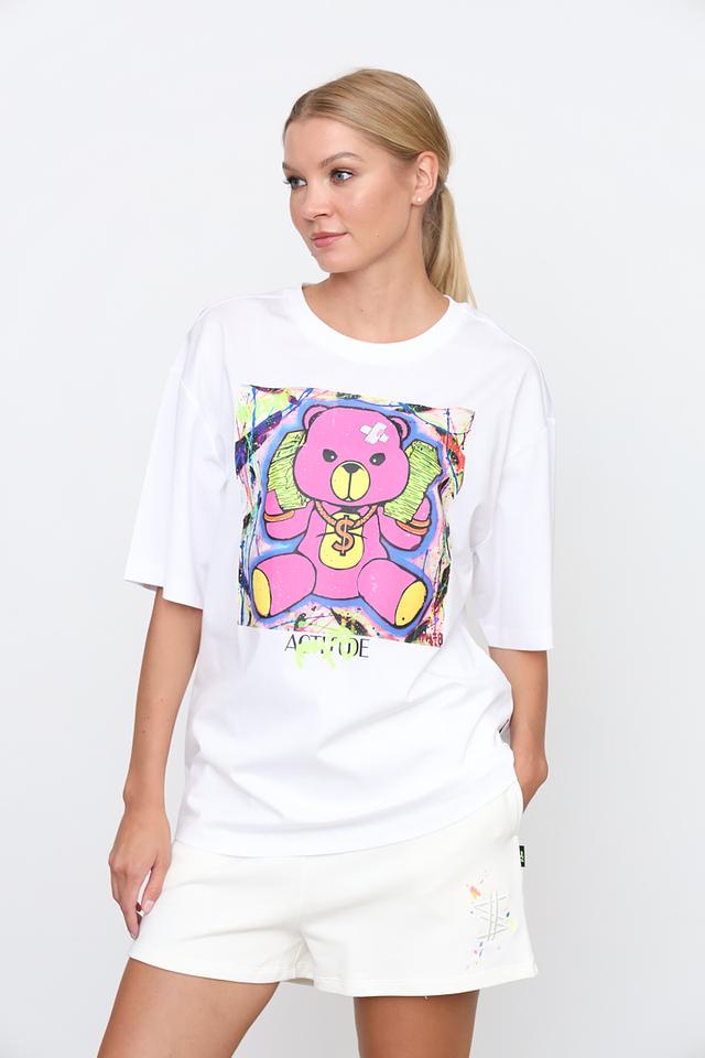 Основным акцентом футболки является крупный, красочный принт с изображением розового медведя. Принт выполнен в ярких, насыщенных цветах, что делает футболку заметной и привлекательной.