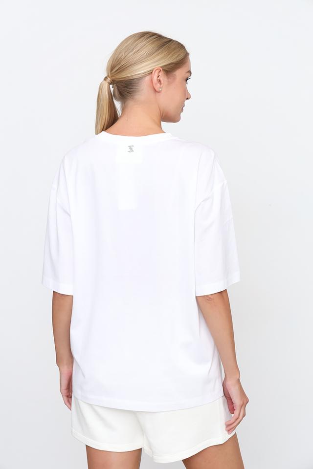 Фасон футболки – свободный, оверсайз, что обеспечивает свободу движений и позволяет создавать различные стилистические сочетания. Короткие рукава делают футболку идеальной для теплой погоды. На спине расположен небольшой логотип бренда.