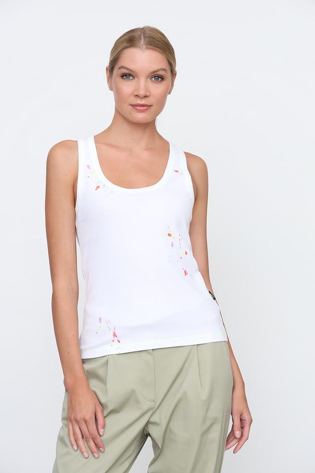Белый топ Twin Set Actitude — это стильная базовая вещь с оригинальным дизайном в виде разноцветных брызг. Модель выполнена из мягкого хлопка с добавлением эластана, обеспечивающего комфортную посадку. Состав: хлопок 95%, эластан 5%
