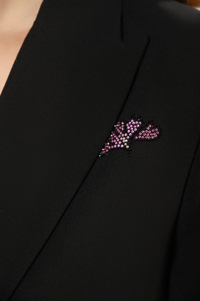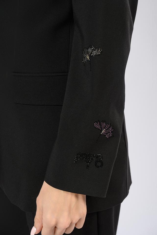 Жакет украшен декоративной вышивкой и аппликациями, которые придают ему индивидуальность и изысканность. Внутренняя подкладка выполнена в ярком розовом цвете, что добавляет неожиданный акцент и делает этот жакет еще более привлекательным.
