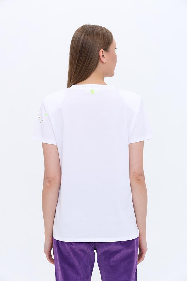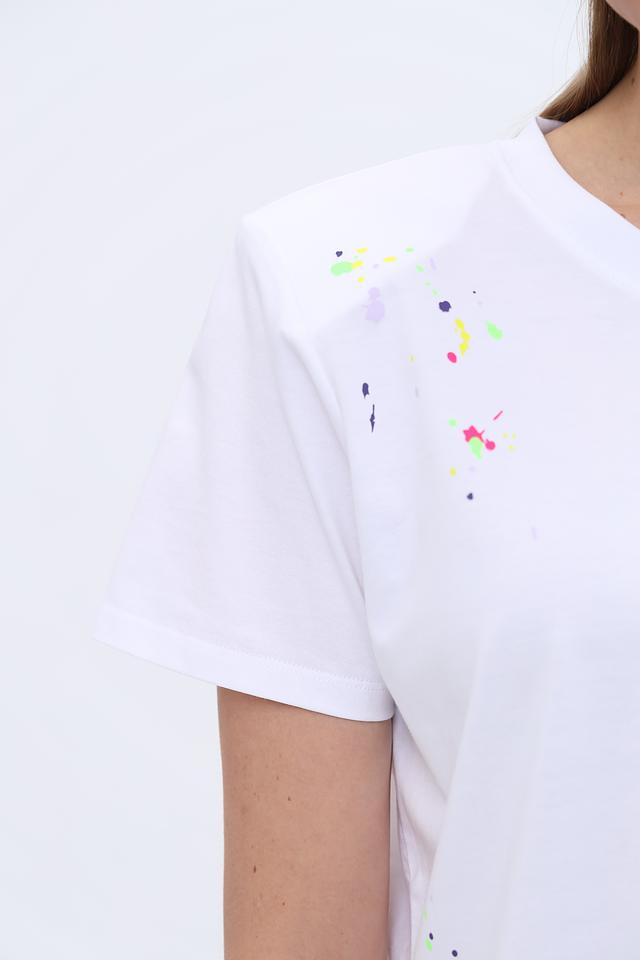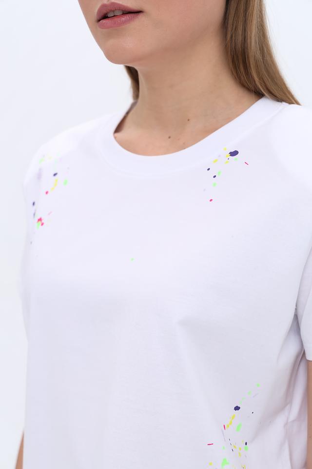 Белая футболка Twin Set Actitude с оригинальным принтом в виде разноцветных брызг. Модель из 100% хлопка обеспечивает комфорт и удобство в повседневной носке. Стильный и современный выбор для создания яркого образа. Состав: хлопок 100%, Состав_2 хлопок 95%, Состав_2 эластан 5%