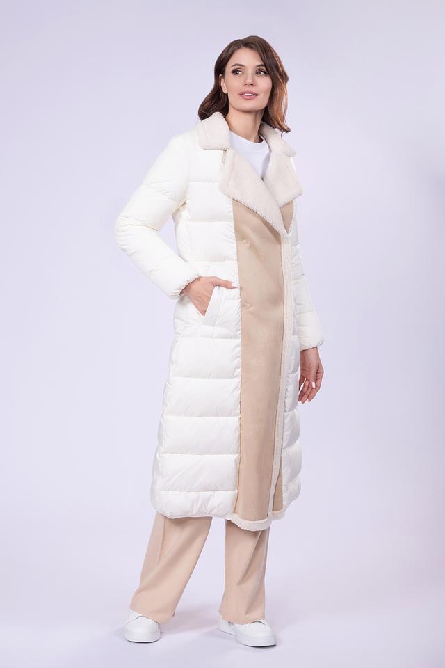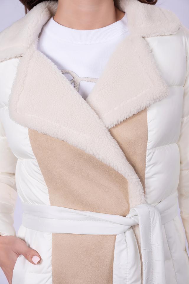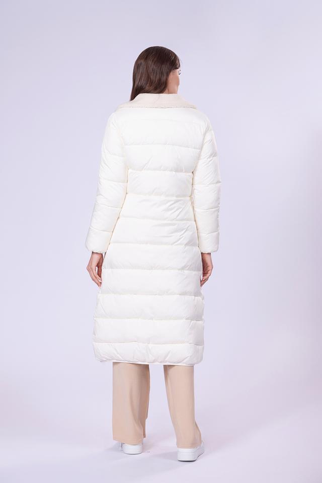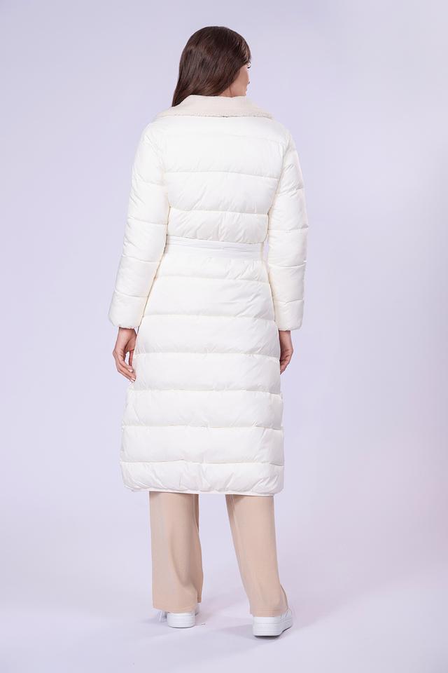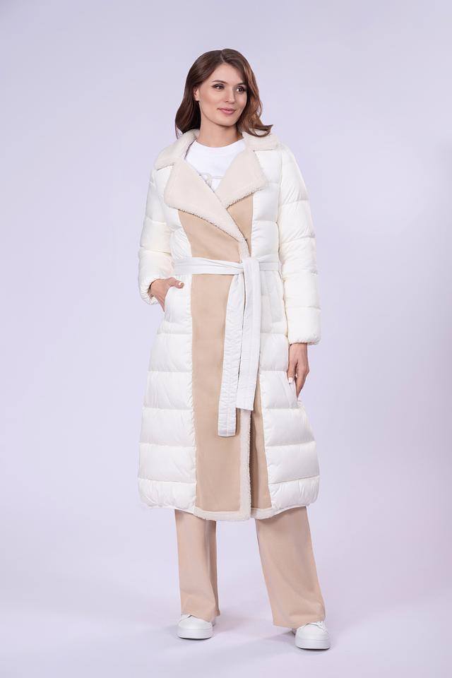 Модель имеет прямой крой и длину до середины икры, что делает ее универсальной для различных образов. Пальто застегивается на пояс, который позволяет регулировать посадку по фигуре и подчеркивает талию. Стеганая текстура обеспечивает дополнительное тепло и комфорт в холодную погоду.
