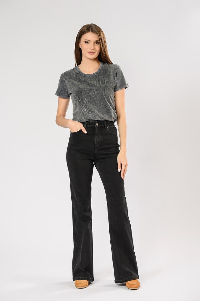 Джинсы имеют высокую посадку, которая визуально удлиняет ноги и подчеркивает талию. Клеш от колена придает образу ретро-шарм и делает силуэт более сбалансированным. Ткань джинсов состоит из хлопка, полиэстера и небольшого количества эластана, что обеспечивает комфорт при носке и хорошую посадку по фигуре.