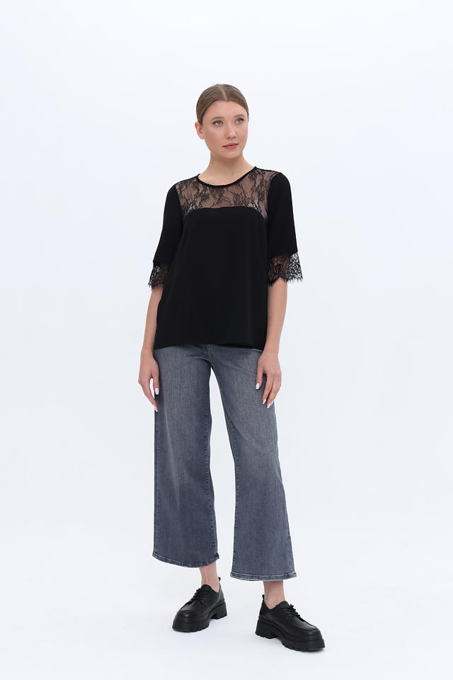 Блуза имеет прямой крой и короткие рукава, украшенные изысканным кружевом. Кружево также присутствует на горловине, добавляя изделию женственности и утонченности.