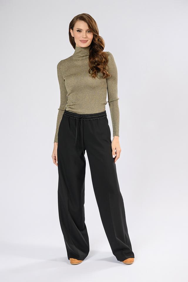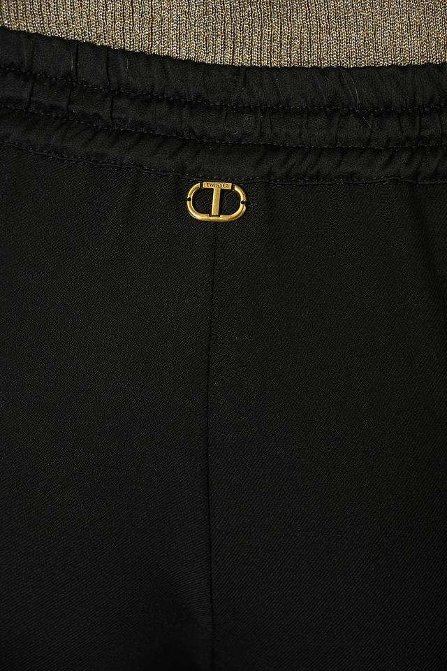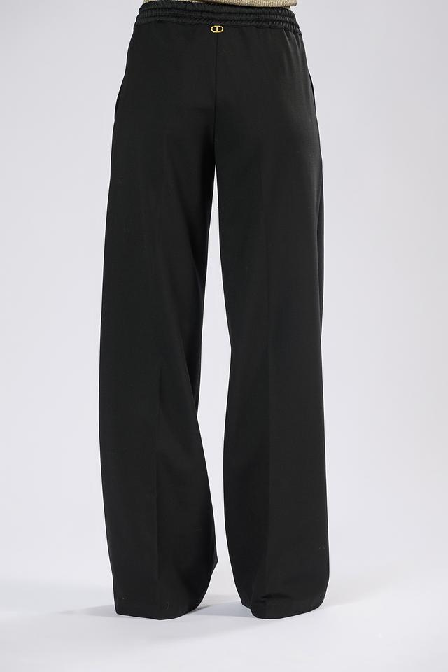 Чёрные брюки палаццо от Twin Set — элегантная и комфортная модель с завышенной талией и эластичным поясом. Идеальный выбор для создания стильного образа в повседневной жизни. Состав: полиэстер 53%, шерсть 43%, эластан 4%