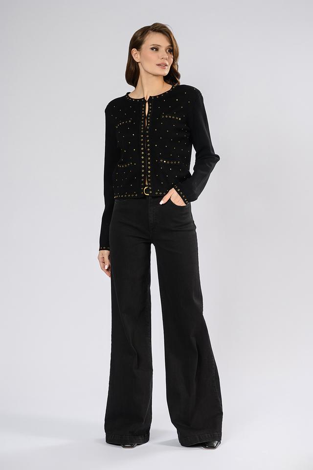Чёрные джинсы клеш от Twin Set — стильная и комфортная модель из хлопка с добавлением эластана. Классический крой и пояс с золотой пряжкой подчеркнут вашу индивидуальность. Состав: хлопок 98%, эластан 2%