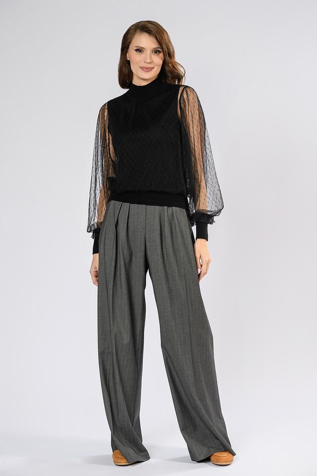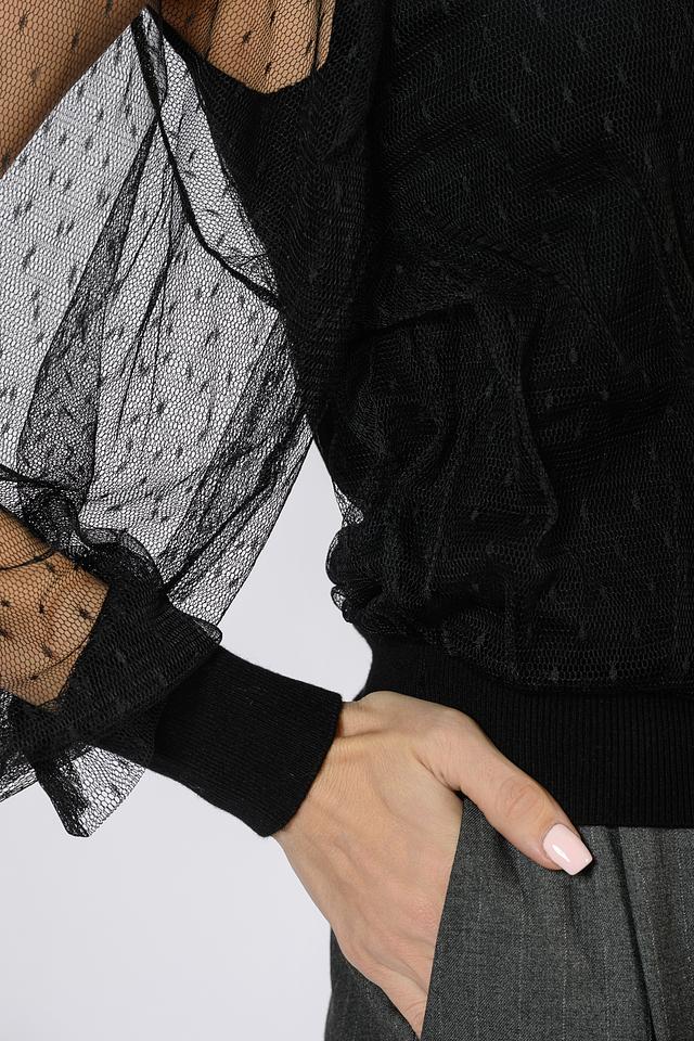Особенностью данного джемпера являются рукава-фонарики, выполненные из полупрозрачной ткани в мелкий горошек. Этот элемент придает изделию лёгкость и романтичность. Основная часть джемпера выполнена из мягкой и приятной к телу ткани, в состав которой входит вискоза, полиамид, шерсть и кашемир.