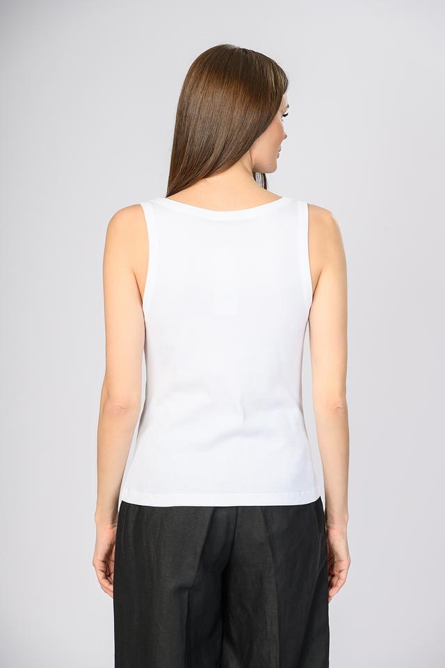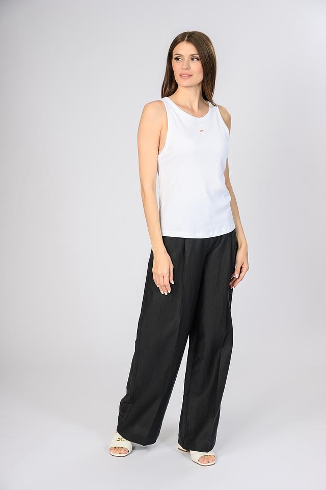 Модель имеет прямой крой и тонкие бретели, что придает ей легкость и изящество. Небольшой декоративный элемент с логотипом бренда добавляет блузе индивидуальности и узнаваемости.