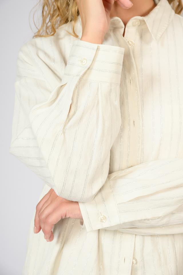 Эта блуза от Twin Set станет прекрасным дополнением к вашему гардеробу. Выполнена в нежном бежевом цвете с вертикальной полоской, что визуально вытягивает силуэт.
