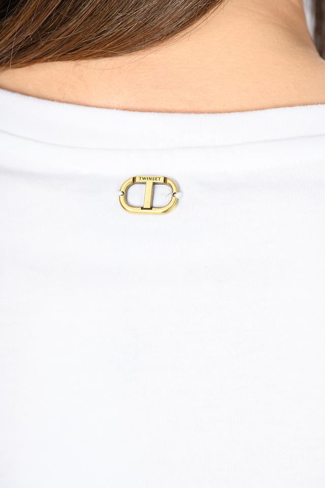 Особенностью данной модели являются короткие рукава, украшенные нежным кружевом. Кружево придает блузе романтичный и изысканный вид. Вырез горловины классический, круглый. На груди расположена небольшая золотистая эмблема бренда Twin Set.