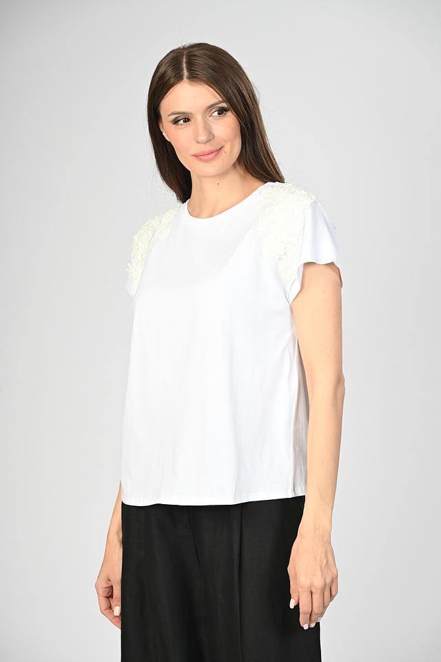 Белая блуза от Twin Set с изящным кружевным декором на плечах. Эта модель из 100% хлопка отличается комфортным кроем и стильным дизайном, идеально подходящим для создания повседневных образов. Состав: хлопок 100%