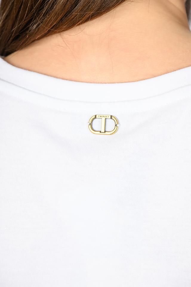 Блуза имеет прямой крой и короткие рукава, что обеспечивает свободу движений и комфорт в жаркую погоду. На спине расположена декоративная золотистая эмблема Twin Set. Состав: 100% хлопок.